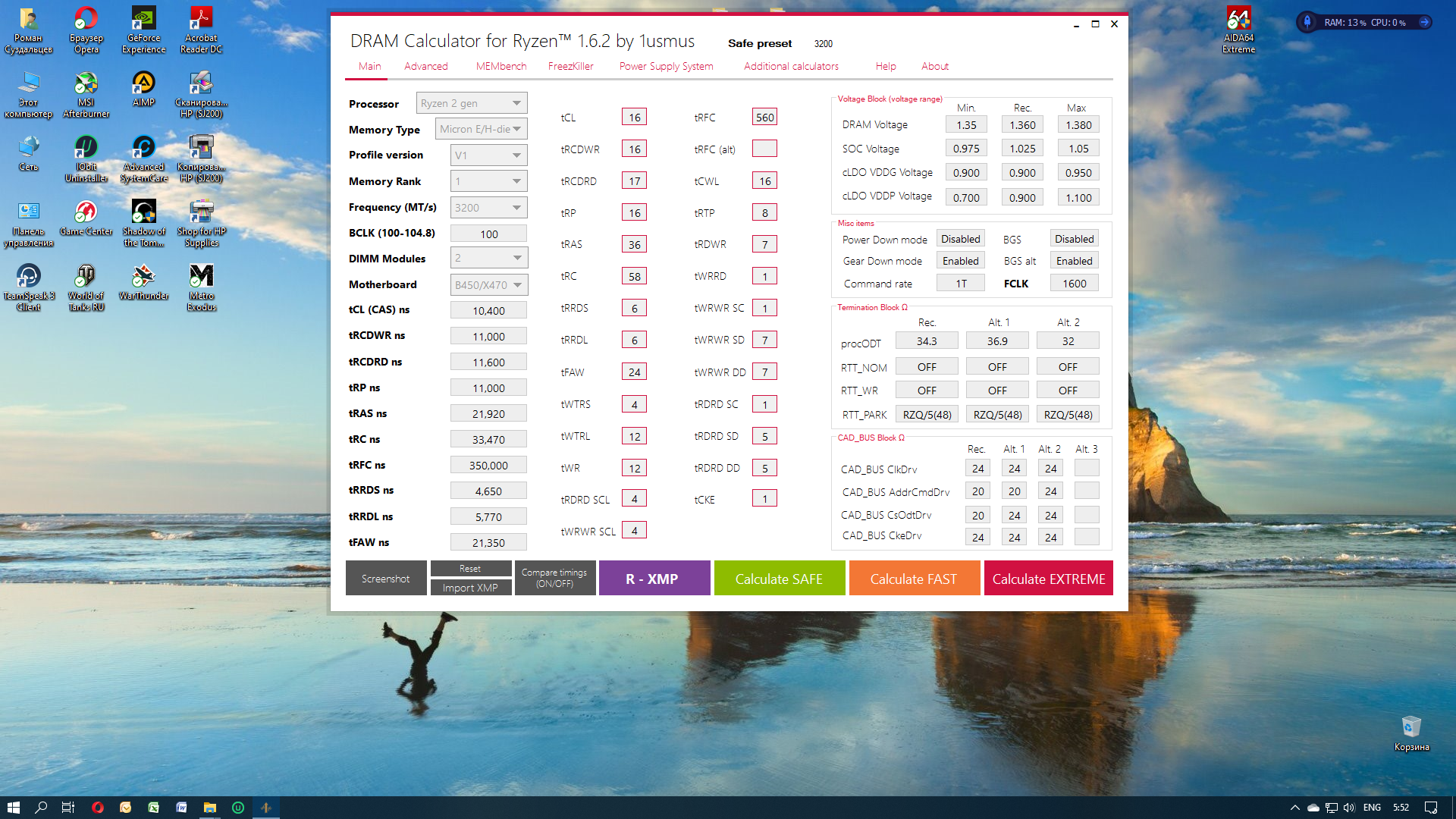 SRV1977 Короче, Тайфун тебе не нужен, как и Фотошоп. Выбираешь 3600, Профиль V1, свой процессор/чипсет, нажимаешь R-XMP, потом Calculate SAFE. Вбиваешь значения в БИОС, включая все напряжения и сопротивления. С чем у тебя сложности? Не стартует?