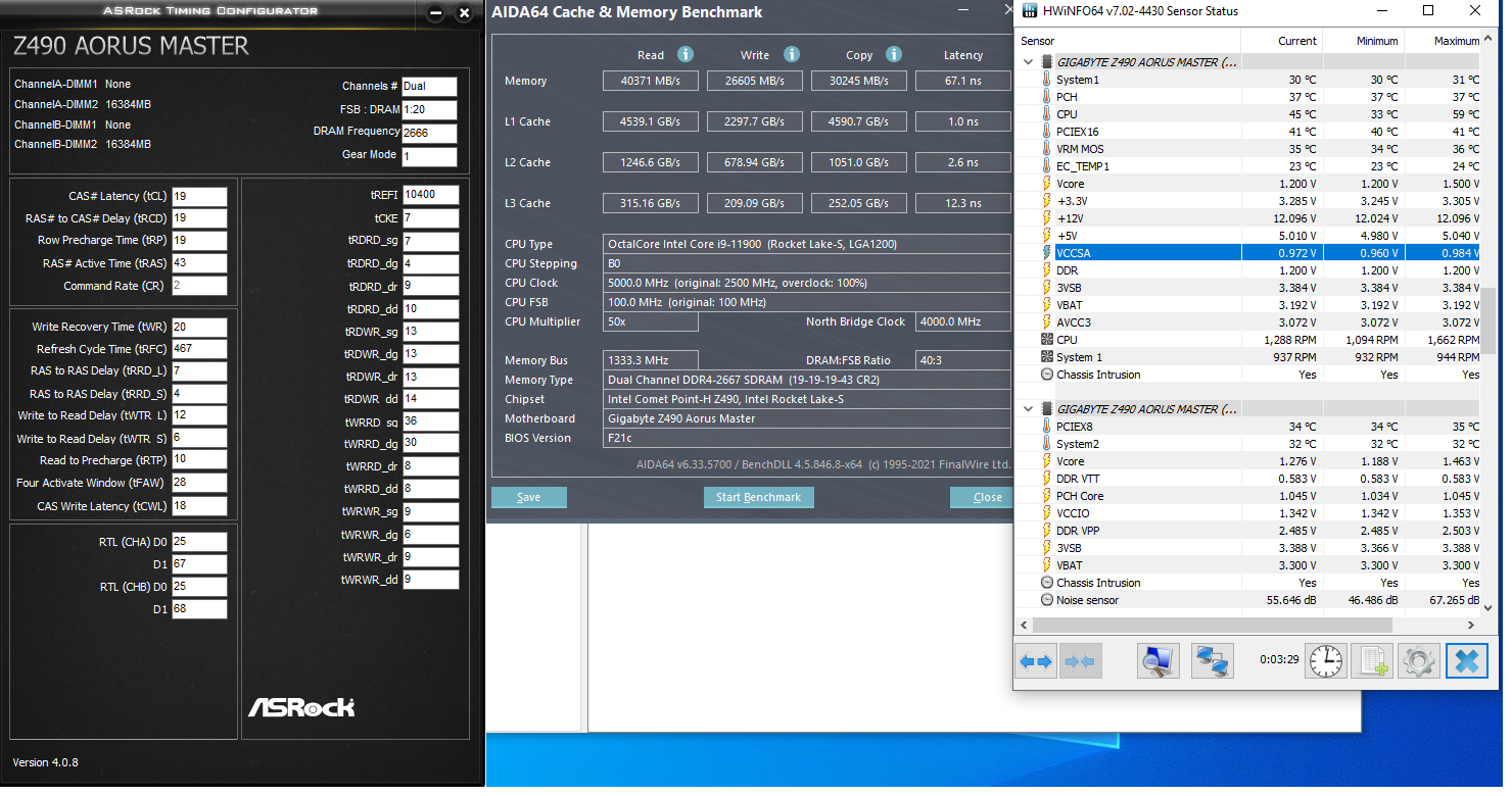 Приветствую! Есть вопрос по напряжению на контроллер памяти Rocket Lake. Какие, по Вашему мнению, допустимые значения напряжения VCCSA и VCCIO2? Я перерыл кучу тестов, и что я вижу: 1. Напряжение VCCIO2 в ХМР профиле на разных материнках гуляет от 1.240 до 1.496 В. При чем, без разницы, что gear 1, что gear 2. Хотя, казалось бы, в gear 2 напряжение должно быть меньше, так как частота контроллера памяти ополовиненная. На моей материнке Z490 Aorus Master F21C не зависимо от частоты памяти и режима gear 1/2 VCCIO2 всегда 1.342 В. Я даже пробовал включать профиль 2666 МГц на память по JEDEC - плата все равно ставит на VCCIO2 1.342 В. Есть ли смысл вообще трогать напряжение VCCIO2? Например, снижать? 2. Напряжение VCCSA для режима gear 2 не понятно какое оптимальное. В обзорах, материнки в режиме gear 2 ставят напряжение VCCSA от 1.148 (DDR4 4133 МГц) до 1.404 (XMP 4800 МГц). Моя плата Z490 Aorus Master F21C выставляет VCCSA 1.342 (DDR4 4266 МГц) и 1.480 (DDR4 5033 МГц). На частоте 4266 я снизил VCCSA с 1.342 до 1.200 В. Работает стабильно. Работает даже на 1.150 В. Возможно и ниже. Есть ли смысл мне снижать до минимума VCCSA и что при этом делать с VCCIO2? П.С. Интересный момент. Тестировал свою память на частоте 2666 МГц по профилю JEDEC. Удивился, что скорость записи почти в два раза меньше, чем чтения. При этом, VCCSA 0,972 В, а VCCIO2 - 1.342 В.