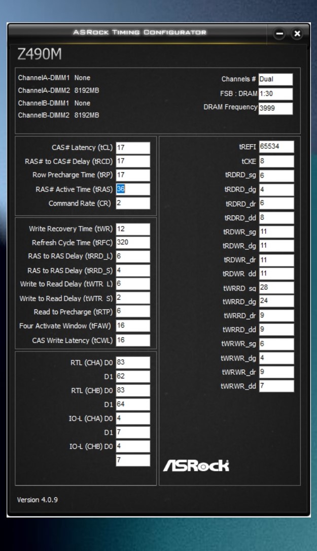 Начните с RCD, CL. Не обязательно должны быть одинаковыми, обычно CL идёт меньше чем RCD. RAS сразу пробуйте как RCD+CL+4, до этого значения от него существенная разница, дальше меньше. CWL<=CL. Допустимые значения 9,10,11,12,14,16,18,20. RP можете выставить по RCD, если пойдёт меньше - тоже неплохо, не уверен правда насчёт смысла. RTP без формул. Если не идёт вниз можно попробовать поднять чуть чуть RP. В DDR4 явно связан с WR соотношением 2 к 1 (например WR20\RTP10), физически хранится одно значения и в зависимости от операции интерпретируется. Скрутите FAW до 16(так и оставьте если работает). С таким FAW скручивайте RRD(оба, L обычно больше чем S), возможно поедут на 4 оба. Если до 4 не удалось спустить поднимите FAW до уровня RRDL*4 и попробуйте ещё, хотя это скорее всего уже почти предел. Обычно L>=S. L - SG(Same Group). S - DG(Different Group) Напр. RRD_L>=RRD_S. CKE=5 СCDL>=4 RDRD_DD и прочие подобные можно проигнорировать если у вас нет двух планок на один канал (4 планки). DD-Different Dimm. Тоже самое с DR-Different Rank если у вас одноранговая память. RDWR_SG(DG) и подобные сочетания скручивайте до минимальных рабочих, потом накиньте сверху +2. Как уже отметил обычно SG>=DG. WTR не трогайте он сам спустится когда будете скидывать WRRD_SG(DG) и прочие подобные. Если сам меньше не стал тогда руками скидывать. WR снижать через WRPRE если есть. Если нет или не снижает WR, То скрутите его скажем до 12 или +4 от рабочего, потом дожмёте если не лень будет. RFC явных формул нет, крутить после всего списка сверху. Не пытайтесь найти его минимальное значение если не хотите чтобы память начинала сыпать ошибками от любого чиха. найдите пограничное со стабильностью значение и накиньте сверху 20 или сразу 40. Может реагировать на RAS+RP, RRD, FAW, причём в обе стороны (то есть может "сломаться" если задрать названные), а может и не реагировать... REFi больше лучше. Связан с RFC. REFI сколько память "работает" - RFC сколько "отдыхает". Оба тайминга лучше не пытаться найти предельное значение.Заметно реагируют на температуру. Многие тайминги отзываются и на температуру и на напряжение. Поскольку напряжение может как позволить снизить тайминг, так и увеличить температуру, то середину можно искать очень долго, поэтому лучше бы вовремя остановится. Тестируйте тщательно с перезагрузками, сном, холодным стартом. RTL и IOL вам кто-то другой пусть советует как настраивать, от них у меня голова болеть начинает...