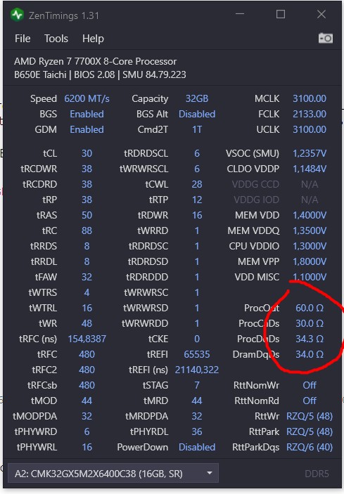Всем привет! Имеется память Kingston Fury KF564C32-16 (6400) две плашки по 16 Гб (M-die, на сколько понимаю). Сейчас работают на профиле XMP с частотой 6000 Мгц. Хочется оптимизировать тайминги для этой частоты. Если есть владельцы такой же память, могли бы скинуть скрины ZenTimings своих настроек? Было бы здорово. Читаю уже 2 недели ветку и никак не решусь на настройку, столько всего надо учесть. Перешёл с АМ3+ на АМ5 год назад. С DDR3 как-то попроще было... ) Процессор оптимизировал с помощью PBO: курву на -30 и лимит по температуре 85. Стало производительнее и холоднее. И вот хотелось бы память "причесать". Доп. обдув ставить не хочу и запредельный разгон не нужен.