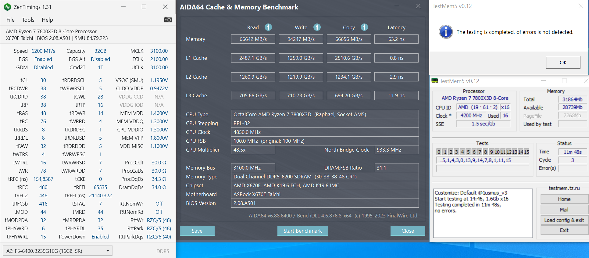 , но как следует не тестировал у себя, с cl30 100% уверен, с 28 возможно придется поднять vdd/q немного. Возможно vddio/vsoc на 0.1 подтянуть. Но на этих границах все довольно индивидуально, от конкретного экземпляра цп зависит, ну и от плашек естественно. Т.е. возможно у вас 6200 и на 1.150 будет норм, а возможно и при 6000 будет не хватать 1.150. Подбирается индивидуально, но 1.140-150 это пожалуй минимальные значения для стабильности 6000-6200.(Пусть меня поправят если я ошибаюсь) Кому то 1.2+ нужно. Ну и с 6200 синхрон достигается при IF 2066. tfrc на adie 120-130нс настраивается индивилуально в конце.