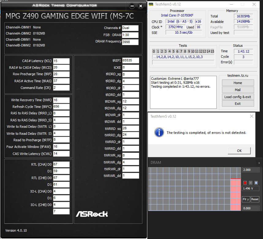 Всем привет. Сам разогнал озу, можете что-то посоветовать что бы поднять частотный потолок ? Выше 4000 никак, нет бута даже. Вольтажи IO/SA поднимал вполть до 1.4V, DRAM до 1.6V, не помогает. На скриншоте полностью стабильный конфиг.