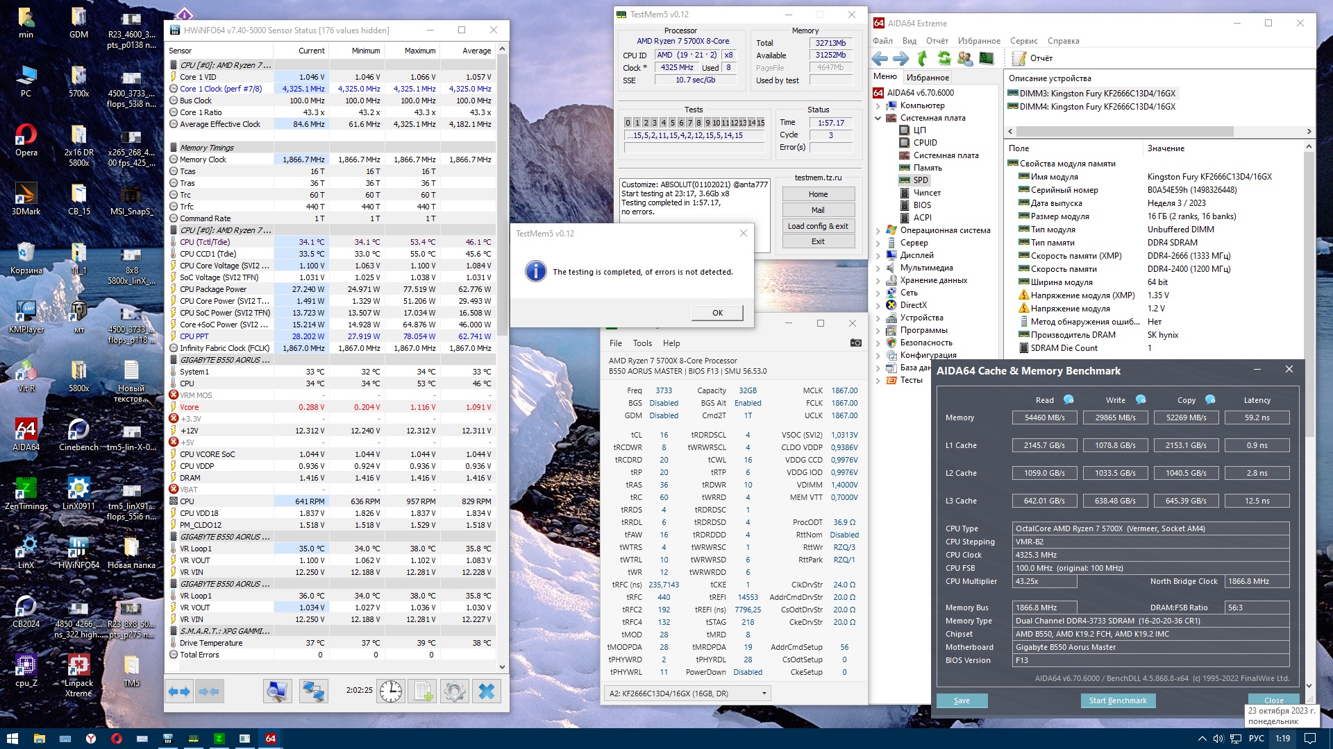 64Gb = x4 G.Skill Trident Z Neo RGB F4-3200C14Q-64GTZN 3666@14-15-14-34-48 2*32Gb ехало на 3733, 4 B-die едут на шаг ниже, результат, вероятно, не максимальный для этих чипов. Или типичный дли бидонов, но у меня камень крайне тугой и выше 3733 не едет в режиме 1 к 1. Нужно подключать активное охлаждение, чтобы гнать дальше, лень и так сегодня день убил на подбор базовых.