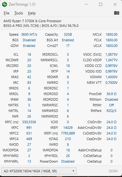 В итоге память, которая на Asrock B450 PRO4 V2 даже в зашитом XMP не могла запустится, на ASUS ROG STRIX B550-A смогла ужаться по калькулятору с напряжением 1,34.