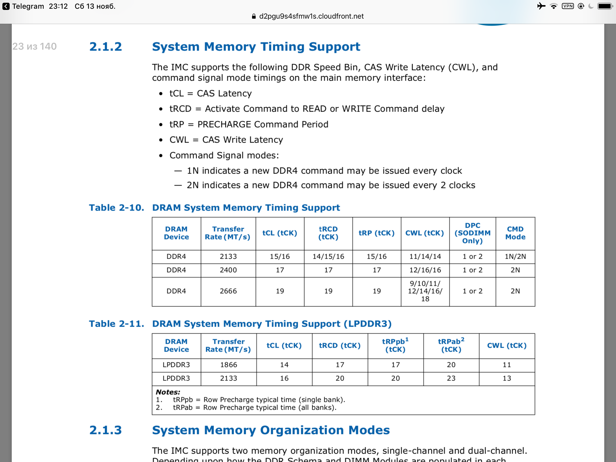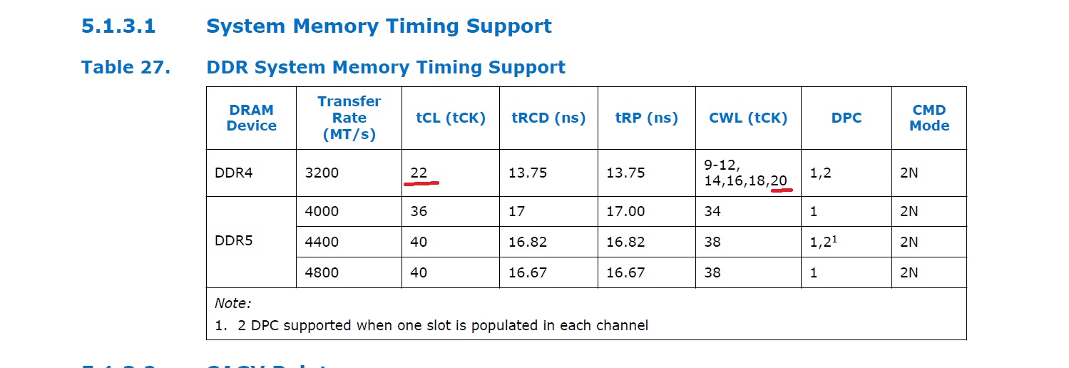 2500К Это ровным счетом ничего не значит, посмотри для самообразования даташиты 10,9,8,7,6-го поколений интела, очень удивишься. Мы не используем ddr4 на частоте 3200 с таймингами от jedec. Тут просто приведен пример, некоторые из возможных комбинаций на этой частоте. Вот и все. Взят для примера средний спидбин AA, а не W, в котором максимальный CWL=CL, и не AC, в котором максимальный CWL=CL-4. Это не требования контроллера, а просто пример.