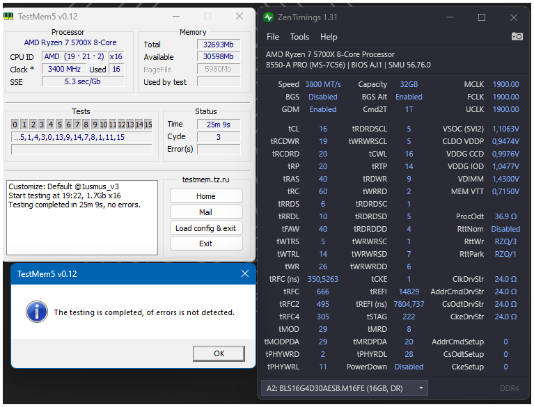 если все нормально, затем снизь вольтажи VDIMM 1.42 VSOC 1,1 CLDO VDDP 0,900 VDDG CCD 0,975 VDDG IOD 1,025 прогони сначало тест оост, если есть ошибки поставь CLDO VDDP= 0,925 или VSOC= 1,125 если ошибок нет анта экстрим прогони, а завта тайминги еще подожмем