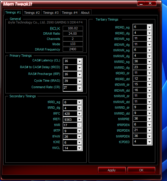 Привет помоги с разгоном 4х планок BLS16G4D240FSE.16FBD Мать Gigabyte z690 Gaming X DDR4