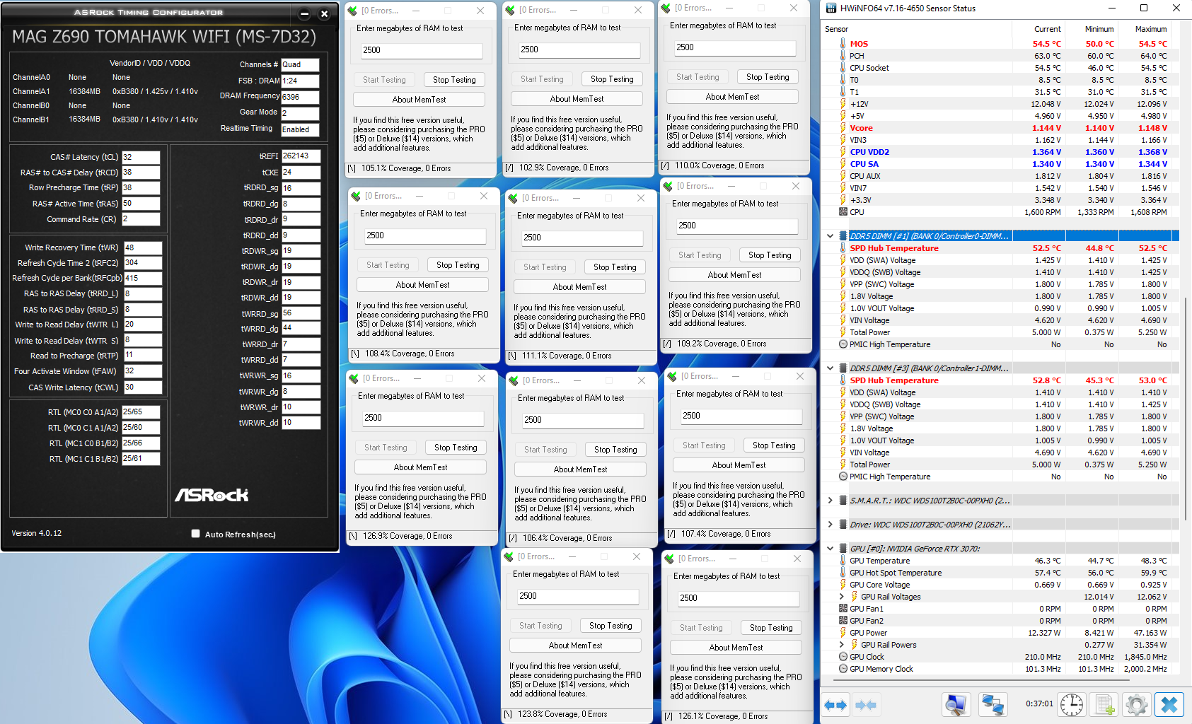 Удалось наконец-то стабилизировать хайниксы при 6400 с таймингами 32-38-38-50 на томогавке, пришлось поднять напряжение SA = 1.35 и VDD=1.43. Пока прогнал 100% HCI memtest и OCCT на память 30 мин, ошибок нет. Что интересно - RDWR ниже 19 отказывается ехать (при 6000 спокойно ехали rdwr=17), также при VDD ниже 1.43 система отказывается стартовать. Прикол в том, что на моей плате VDD 1.43v это максимум, выше не дает ставить=)