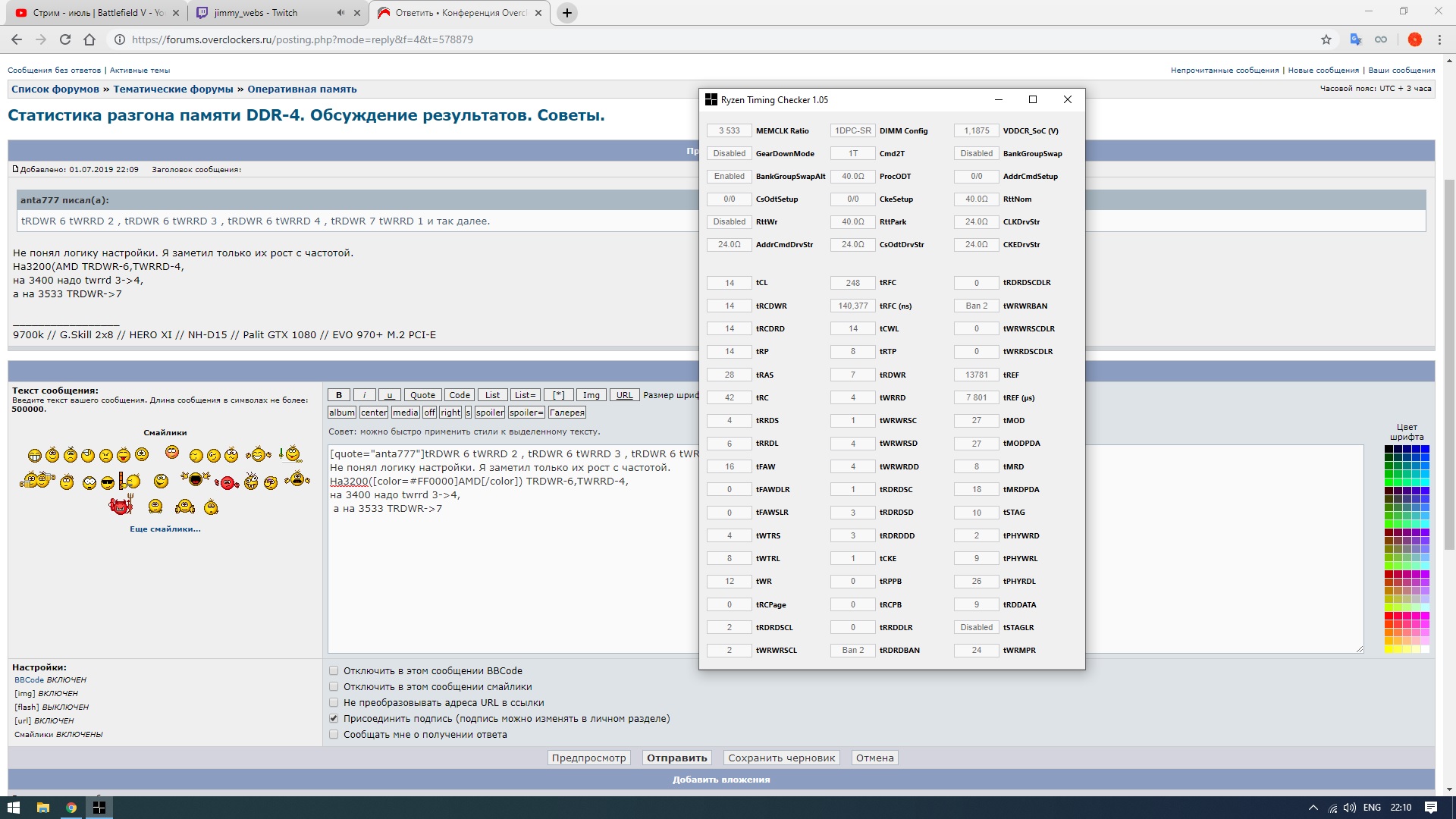 1usmus советует: Единичные и редкие ошибки можно излечить с помощью изменения tRDWR (от 6 до 9) и tWRRD (от 1 до 4). Обратите внимание что тайминги должны настраиваться в паре. Пример : tRDWR 6 tWRRD 2 , tRDWR 6 tWRRD 3 , tRDWR 6 tWRRD 4 , tRDWR 7 tWRRD 1 и так далее.