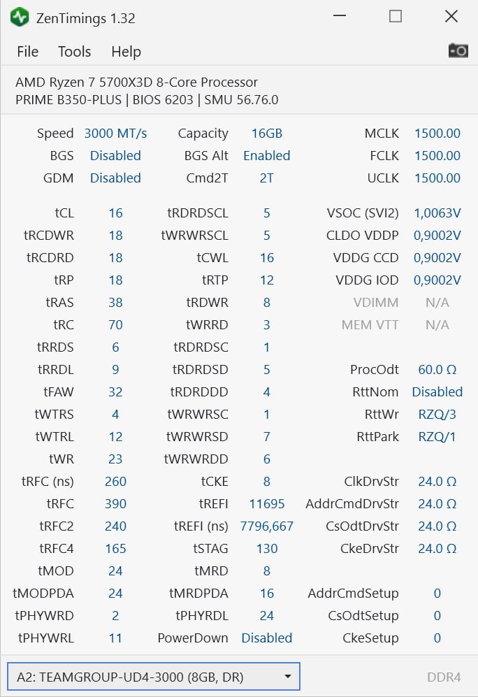 доброго времени суток , нет ли настроек под эту память Thermaltake H-ONE [R021D408GX2-3600C18D] 16 ГБ PRIME B450M-K II материнка, биос последний , процессор 5600. xmp пара тройка ошибок анта екстрим по истечении часа двух , трех .настройки из шапки 5 ошибок там же , настройки калькулятора ,2-3 ошибки. хотелось бы 3600 без фанатизма. параметры изначально брал завышеные , для 3800 , чтобы наверняка . сейчас напряжение 1.35 . на 1.39 ошибок еще больше, обдув стоит для тестов , vsoc тоже своей жизнью живет , на высокой частоте наваливает 1.2 , руками равняю офсетом . руками что то не выходит стабилизировать. забыл добавить , тайминги только первички , остальное в авто