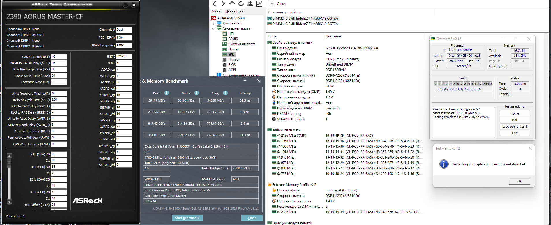 Разгон памяти у современной DDR4 (16 банков,RRDS=4,FAW=16,BL=8) эффективен только при tRC<=64,если каждый новый блок чтения происходит с разных банков памяти. Для 4-х слотовых плат при разгоне желательно в биосе отключить неиспользуемые слоты. Предположительно для максимальной производительности памяти значение tRFC в тактах для 8-Гбитных чипов должно быть кратно 8,а для 16-Гбитных чипов - 16. Если это правило не соблюдать, то будут вставлены лишние такты при каждом цикле обновления памяти. Для желающих максимально снизить tRFC. Делим tRFC на сумму tRCD,tRTP и tRP. Если результат ближе к 4, то снижать tRFC можно по 4 такта. Если результат ближе к 2, то снижать tRFC можно по 2 такта. Это связано с тем, что обновление происходит субмассивами, которые обязательно кратны 2.