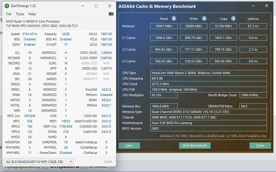 Всем привет, обновил плату на asus strix b550, накатил последний биос. Разогнал память 2 модуля hp на samsung b-die по 8Gb до 3733. Посмотрите, может что пережал или наоборот недожал: #77