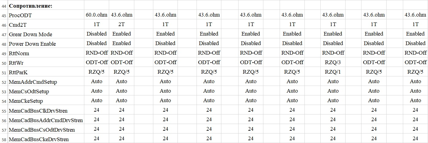 Первичные Тайминги: 1.) # Latency / tCL = 2.) Trcdrd / tRCDRD = 3.) Trcdwr / tRCDWR = 4.) DRAM RAS# PRE Time / tRP = tRC – tRAS 5.) DRAM RAS# ACT Time / tRAS = tCL + tRP, или tRC – tRP 6.) Trc / tRC = tRAS + tRP, или tRAS + tRCDRD Вторичные Тайминги: 7.) Trrds / tRRDS = tRRDS ≤ tRRDL 8.) Trrdl / tRRDL = tRRDL ≥ tRRDS 9.) Tfaw / tFAW = tRRDS×4 10.) TwtrS / tWTRS = tWTRS ≤ tWTRL 11.) TwtrL / tWTRL = tWTRL ≥ tWTRS Третичные Тайминги: 12.) Twr / tWR = tRTP×2 13.) Trcpage / tRCPAGE = Auto 14.) TrdrdScl / tRDRD SCL = 4, 5 15.) TwrwrScl / tWRWR SCL = 4, 5 16.) Trfc / tRFC = Single Rank-8Gb +8:248, 256, 264, 272, 280, 288, 296, 304, 312, 320... Dual Rank-16Gb +16:248, 264, 280, 296, 312, 328, 344, 360, 376, 392... 17.) Trfc2 / tRF2 = Auto 18.) Trfc4 / tRF4 = Auto 19.) Tcwl / tCWL = tCL. Можно Auto 20.) Trtp / tRTP = tWR:2 21.) Trdwr / tRDWR = от 8, 9, 10, 11, Можно Auto, при большом V нестабильны? 22.) Twrrd / tWRRD = 1, 2, 3, Можно Auto, при большом V нестабильны? 23.) TwrwrSc / tWRWR SC = 1 24.) TwrwrSd / tWRWR SD = 6, 7 25.) TwrwrDd / tWRWR DD = 6, 7 26.) TrdrdSc / tRDRD SC = 1 27.) TrdrdSd / tRDRD SD = 4, 5 28.) TrdrdDd / tRDRD DD = 4, 5 29.) Tcke / tCKE = 1 Тайминги 23-29, Single Rank на низких (у меня) до 4066Mhz можно отключить 1