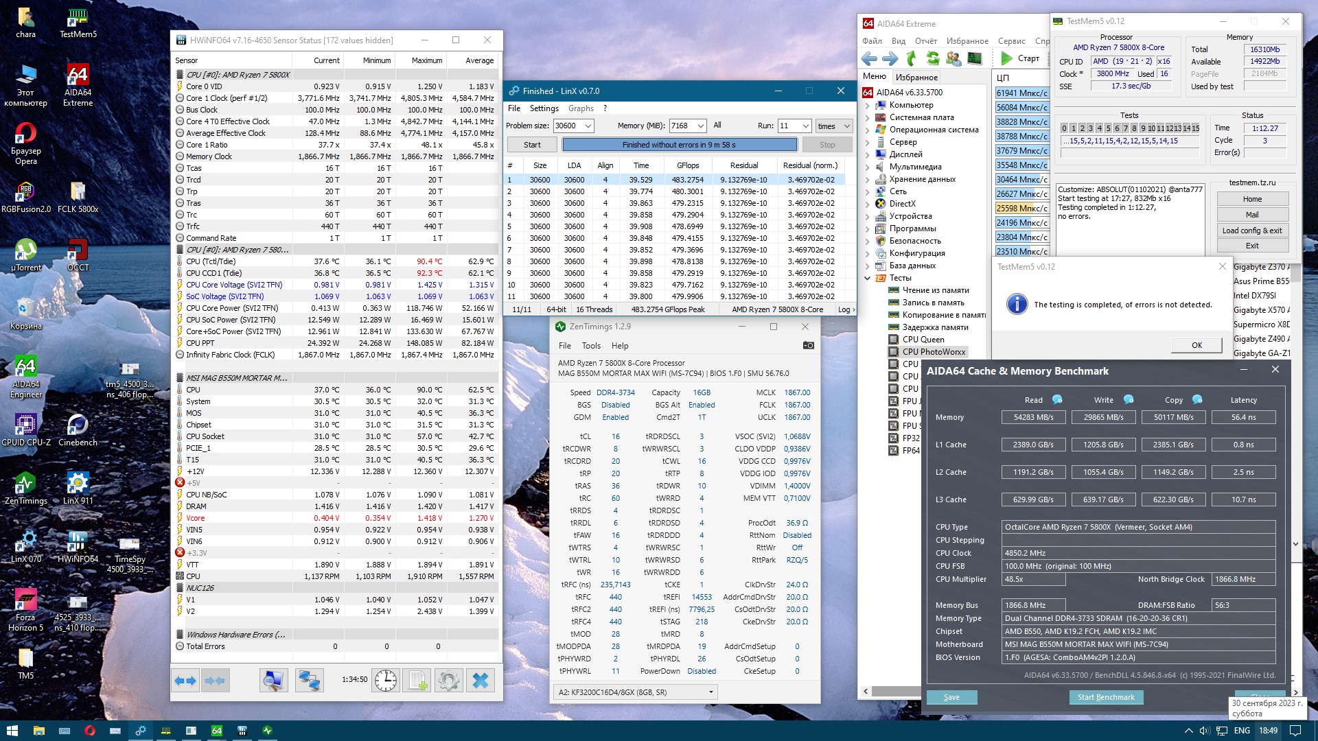 Также заметил после 2-3 часов игры в кс2 появлялись ощутимые фризы без причины на несколько секунд (не знаю, связано ли это с разгоном). И пару раз, при открытии большого количества программ, зависал проводник (т.е. звук шел, дискорд работал, синего экрана не было), но окна не работали; через секунд 15 проходило.