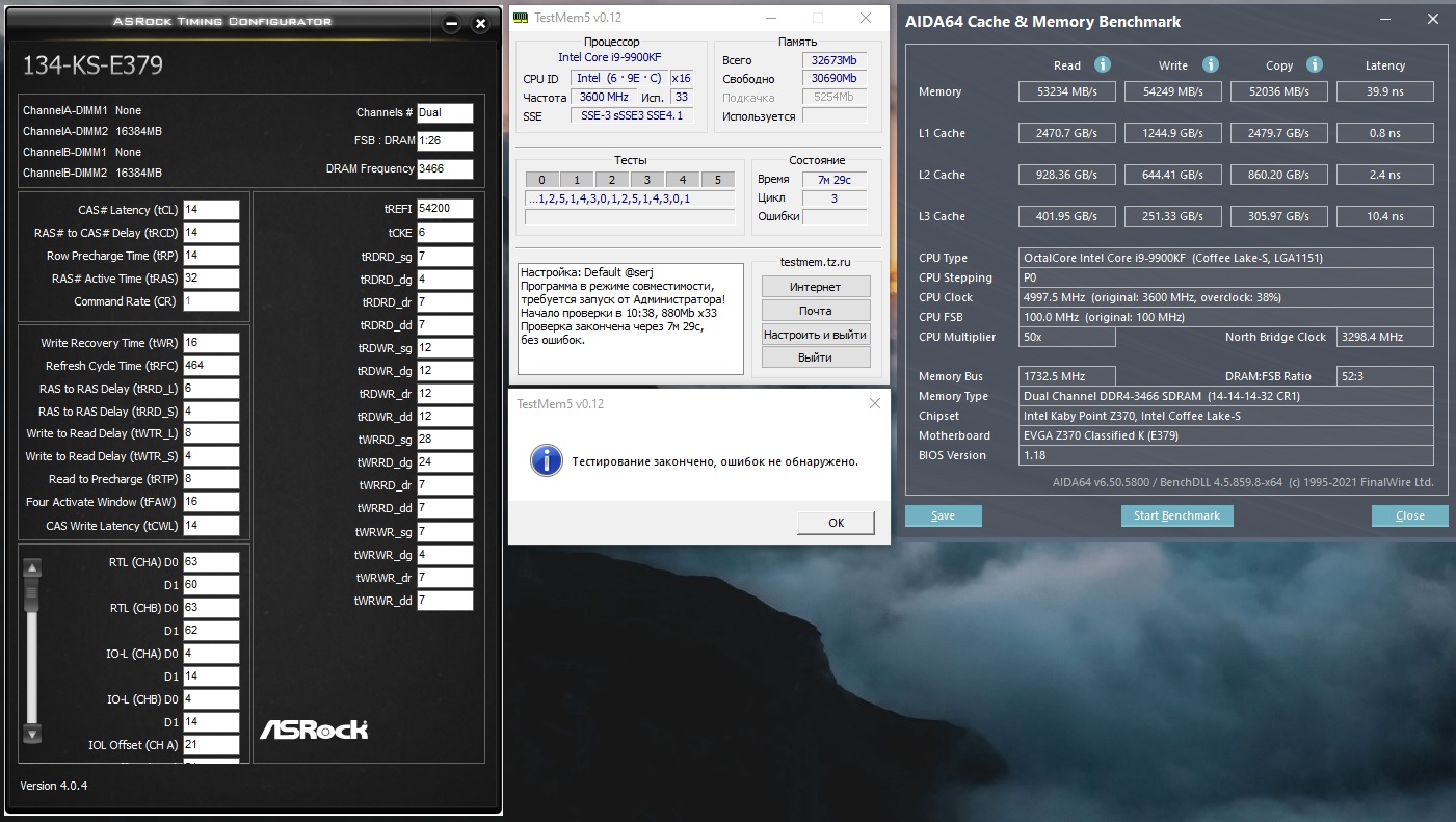 Спасибо, так и сделал. Если не могу пока 3600мгц стабильно освоить, немного поковырял 3466мгц. Некоторые значения пришлось увеличить, так как в ТМ5 было ок, а в гта5 бенчмарк вылетала игра и крашила драйвер видеокарты. Вот что получилось (на скрине нету настроек, но они есть в биосе, выставил tXP 4, tXPDLL 14):