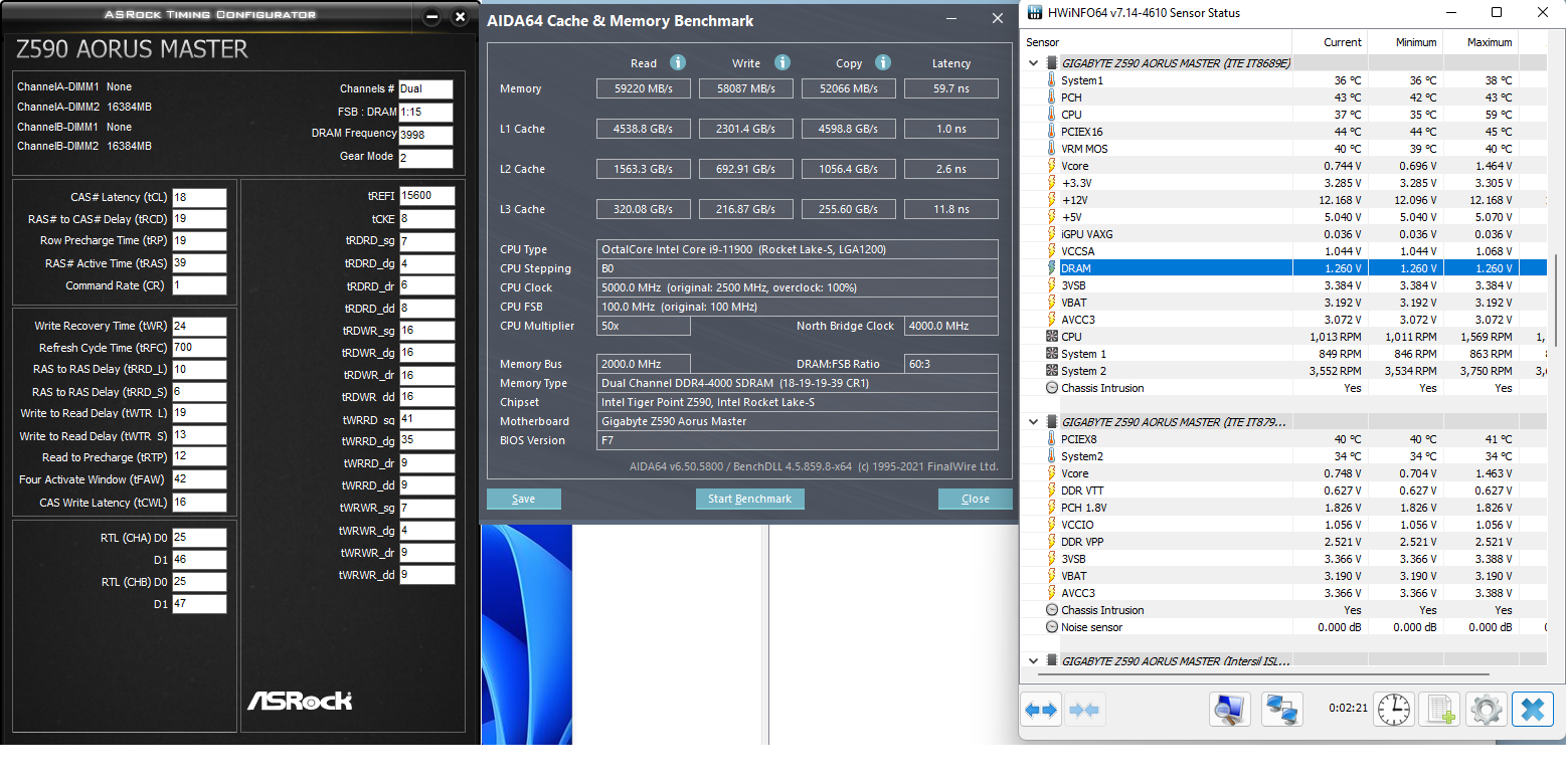 Пришла пора и мне показать свои результаты настройки памяти. Система: процессор i9 11900 (без К), материнка Z590 AORUS MASTER, память Crucial Ballistix MAX 4400 MHz DDR4 (16GBx2) CL19 BLM2K16G44C19U4B. (память одноранк, технология производства 17 нм). Удалось совершить, казалось бы, невозможное: 1. Напряжение на контроллер памяти в рамках спецификации от Intel CPU System Agent 1.05 CPU VCCIO2 1.05 (при напряжении 1 В не запускается плата вообще). 2. Снизил напряжение на память до допустимых 1.35 В вместо штатных по ХМР - 1.4 В. 3. Память включил на 4266 MHz, так как контроллер памяти не поддерживает частоту 4400 MHz. 4. Первичные тайминги оставил, как для профиля 4400 MHz. Параметры tREFI и tRFC пересчитал на частоту 4266 MHz (там линейная зависимость). В результате я получил высокую скорость памяти в режиме Gear 2 с низкой нагрузкой на контроллер памяти. Режим Gear 1 будет на 5% быстрее в играх, но ценой сильно завышенного напряжения на контроллер памяти. В общем, я доволен. Иначе, смысла в памяти 4400 MHz у меня бы не было ни какого.