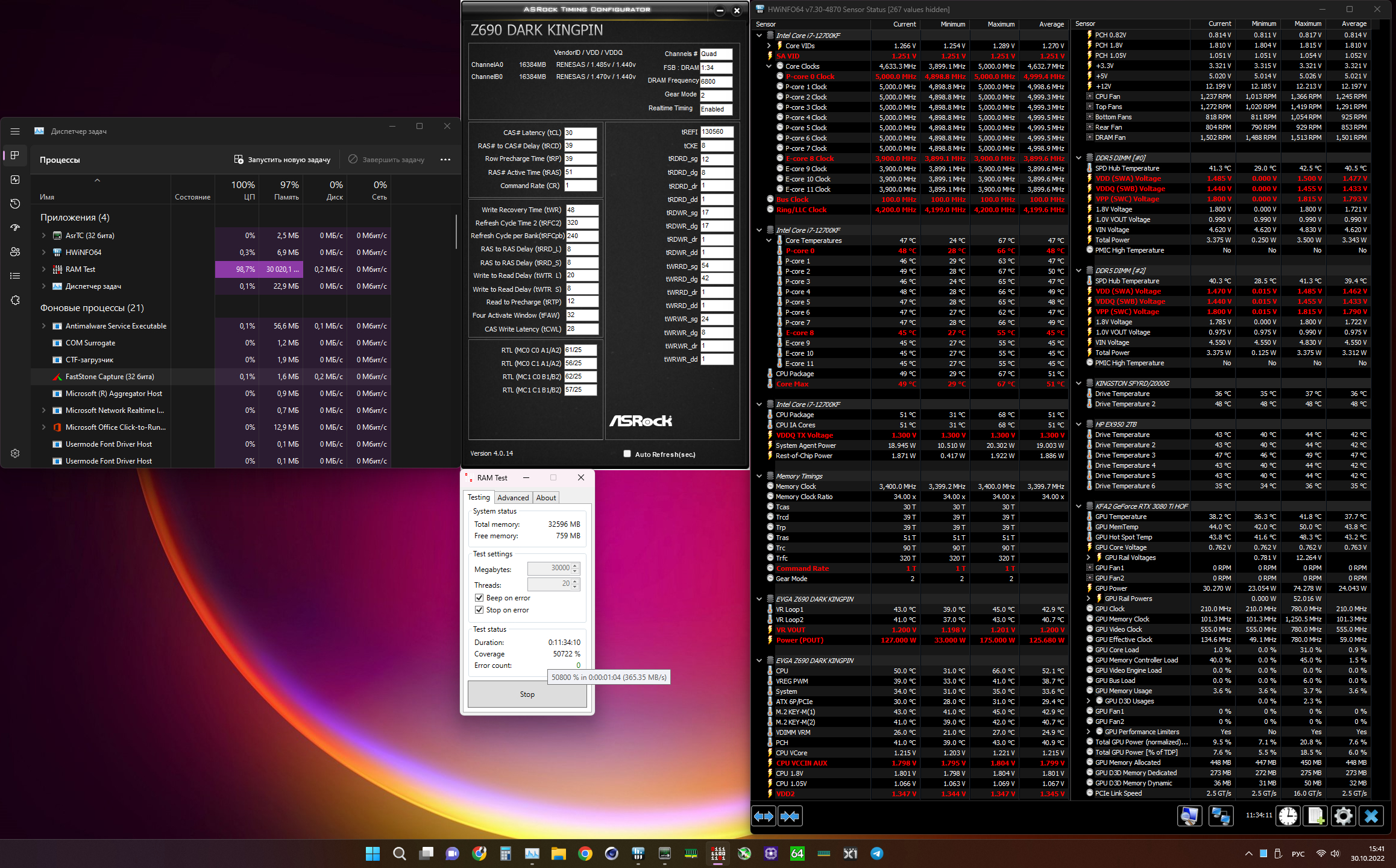Осталось DRAM VDDQ найти минимальный и tREFI/tRFC. CPU VDD2/VDDQ TX/SA пока что сильно не интересуют, работают и ладно. Проверим потом эти модули на 13700KF с этой платой на этом же биосе. А вдруг и 7466 тоже или выше заработает
