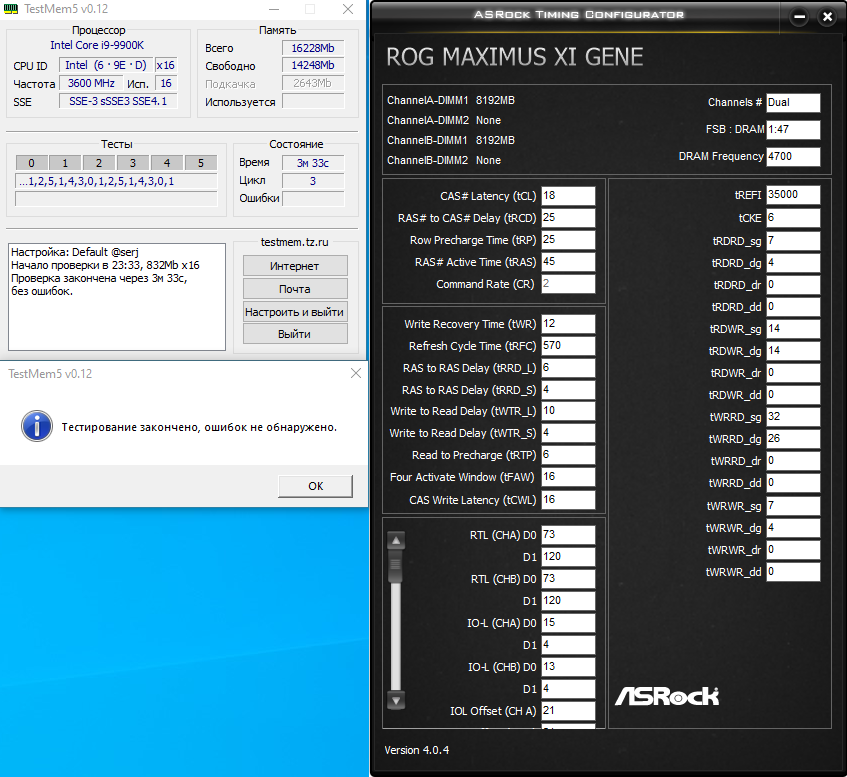 П.С. А еще я понял, что чипы B-Die это не только офигенные результаты разгона, но и очень капризная вещь. До гскилла у меня была деревянная A-Data. Так, вот, если с этой A-Data уже был проведен тест (TM5 с любыми пресетами), то ничего не поменяется уже никогда, т.е. не полезут ошибки ни с того ни с всего, хоть и по результатам эта память не хватала звезд с неба. С G.Skill на B-Die ситуация совершенно другая. Гонится отменно, результаты отличные, очень гибкая в настройках, но присутствует какое-то непостоянство в виде непонятно откуда берущихся ошибок на уже устоявшихся настройках.