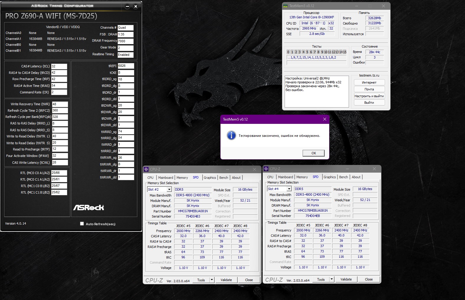 На 7000 уже бессмысленное тыкание (даже в ODT). Овчинка не стоит выделки. Экстрим и мт86 все равно не проходят, остальное не интересует. Как там говорится? Лошадь сдохла - слезь. Не хочу с этими хуниксами более возиться. 6933-32 кр2 могу резюмировать максимальный стаб на этой плате и 6800-32 кр2 на постоянку на неприлично низких вольтажах. Жду A-Die, а затем метеор (либо 13900KS). Плату менять не буду пока. Посвящу время написанию гайда.