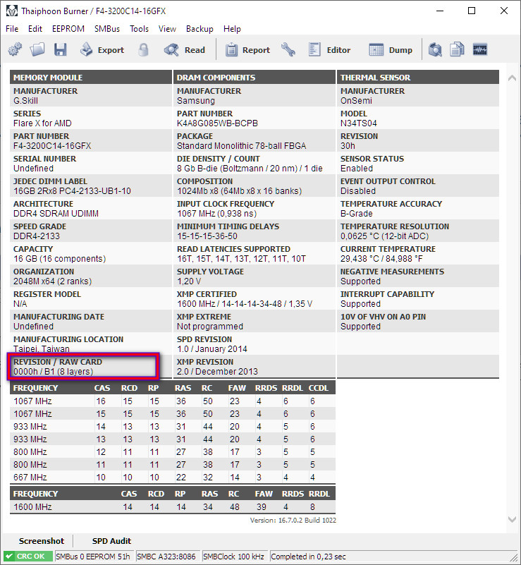 Обозначение печатной платы. Бывает, тайфун врет. Лучший способ - вскрытие (или посмотреть из-под плашек в просвет). Для B-Die планок хорошего качества от G.Skill характерны A2 для синглов и B1 для дуалов. 10-ти слойные. И то, и то - характерное расположение чипов на плате, скомпанованы по 4 штуки, с левой и с правой стороны. Подробнее - в шапке. На разгон влияет, конечно.