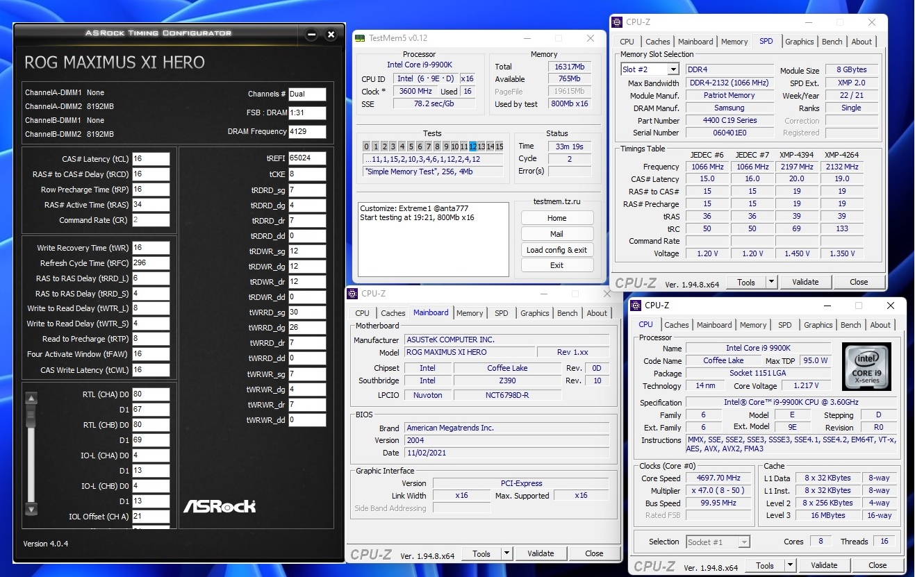 Коллеги, подскажите, что за странность: после смены матери с EVGA Z390FTW на Maximus XI Hero комплект Patriot Viper Steel 4400 19-19-19-39@1.45v на свежих B-Die (середина 2021) таки пошел далее психологической отметки в 4ГГц (на EVGA пришлось остаться на 3630 14-14-14-28-1Т@1.425v). Первый же день после сборки был посвящен настройке памяти. ЦП пока вообще не трогал, стоит по умолчанию. Итак, XMP что первый (4400), что второй (4266) - совершенно бесполезны, ибо не заводятся, как не играйся с напряжениями (в рамках адекватных значений для повседнева). Остановился на 4133 16-16-16-34-2T@1.46v; SA/IO 1.25v. Настройка таймингов по таблице anta777, с рекомендованными значениями, с пробегами TM5 с Extreme пресетом минут по 10-15. Далее, само собой, перешел к столбцу таблице "Лучше". По одному, с короткими пробегами на ошибки и откатом на рекомендованные значения в случае их (ошибок) появления. В общем, к концу дня сделал достаточно долгий забег с настройками в скриншоте: 35 минут, все ок, система работает адекватно. Сохранил настройки в профиль в биос, выключил ПК и ушел спать. Утром первым делом наторожил очень долгий запуск. А вот далее-совсем непонятно: вместо предварительно стабильной работы система даже ОС не в состоянии загрузить. Максимум - вижу рабочий стол и тут же bsod. Биос обнулял, загружался с того самого профиля - итог тот же, даже не могу в винду зайти. 1.46v; SA/IO 1/25. Пробовал добавлять напряжения до 1.5, 1.30, 1.30. Без толку.