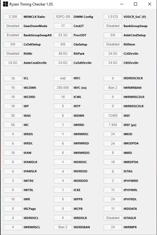Если пройдет тест ставь tFAW 24, tWR 16, tRTP 8, tRDWR 8, tWRRD 3, PowerDownM OFF, tCKE 1. Снова запускай ТМ5 tRFC тюнить надо в последнюю очередь, т.к он может быть источником синих экранов в первую очередь Вольтаж на SOC у тебя завышен очень сильно, ставь офсетом в - 0.05. Не забывай это делать когда разгоняешь память, для 3200 этого с головой. Когда будет все стабильно его можно будет спустить до 1.0250
