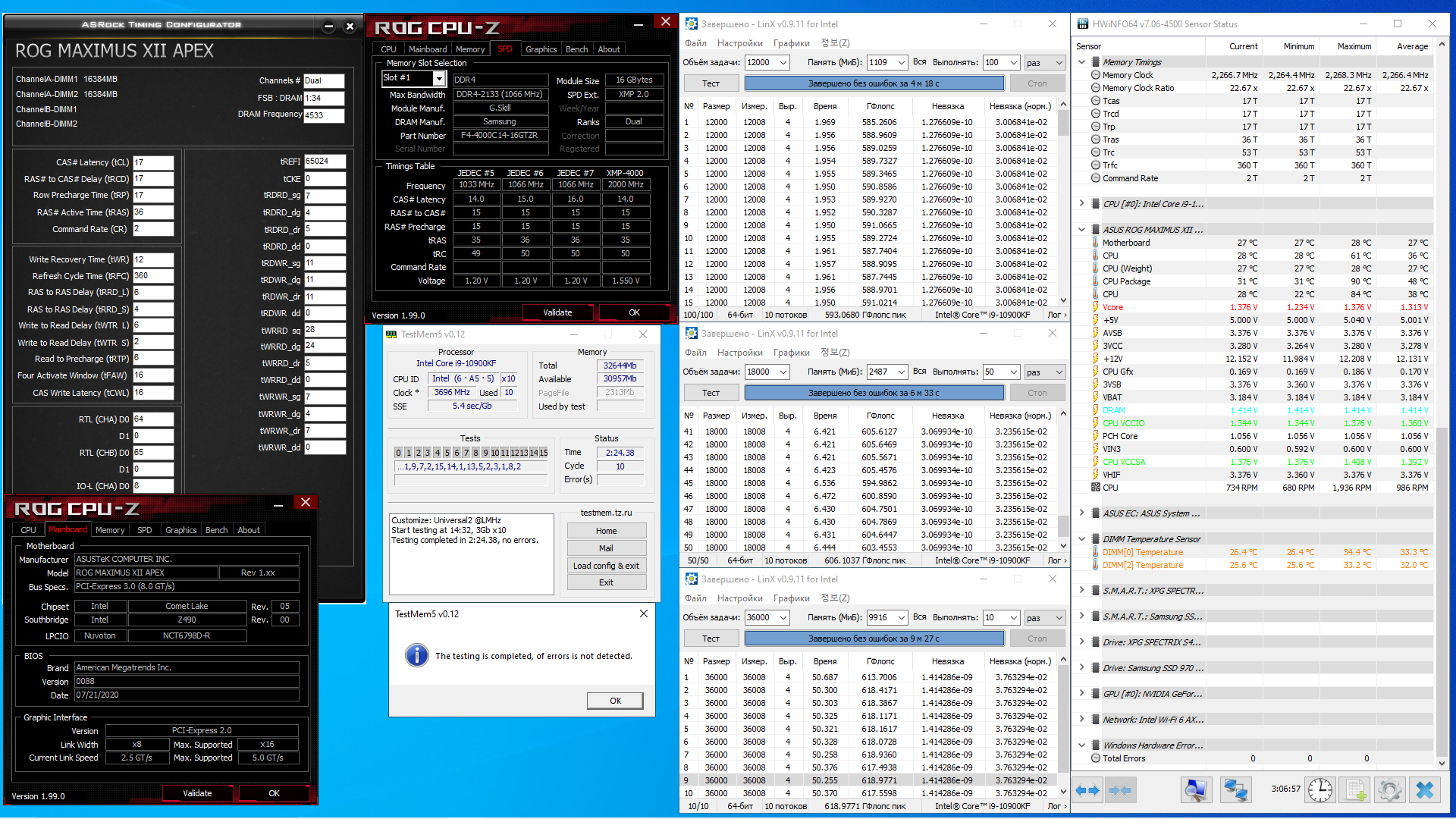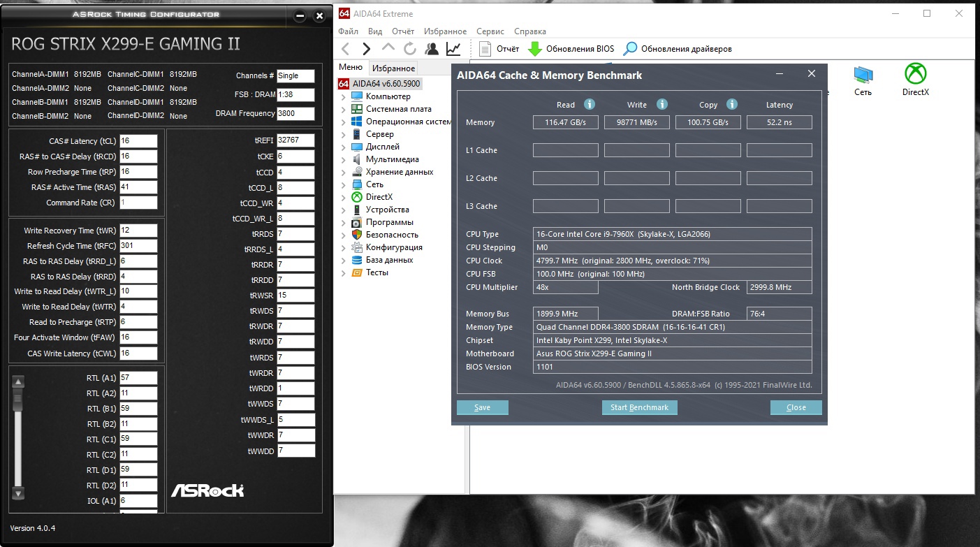 Asus Z170I Pro Gaming F4-3200C14-8GVR 2шт по 8Гб одноранги. G.Skill Ripjaws V Red 2133 XMP 3200 (при xmp м.п. тайминги дурные выставляет). Печатная плата A2. Хорошие Самсунги B-die K4A8G085WB-BCPB. Радиаторы AboStudio DimmArmor, тяжёленькие. i3-7100 Скальпирован с ЖМ под крышкой, но это вряд-ли на что-то влияет. Кулер Intel с медным сердечником на 1550rpm (50% выставлено в биосе). В прайм95 ЖМ сбило температуры с 74С до 68С, потребление порядка 40-45Вт. На полных оборотах 2550rpm температуры на 5С ниже. Без нагрузки 40+-1С, ЖМ практически не повлиял. Напряжение на память 1.56В, SA 1.36В, IO 1.35В. В тестах датчик на памяти с трудом прогревается выше 50С, 55С - максимум что видел с открытым корпусом. До 80 не зажарю))) сколько на чипах, непонятно, конечно Пока условнонестабильно, TM5 дефолтный тест проходит. Разумеется, надо делать обдув и тестить тщательно. Выставлять точнее напряжения, возможно поджать тайминги. Аида ПСП 54-62-50гбc-40нс. 4100 CL15-15 320RFC CR1 iol7 (тонкие настройки не подбирались, стабильность тренировки - отношение память/са-ио, 1,56/1,36, см. выше) Поначалу казалось что идут только 16-18 на 3800..4100. Возможно из-за зависимостей каких-то или что-то где-то "заело". После сброса на авто, xmp, и выставления таймингов пошли cl14 на 3800, 15 на 4100. Наконец-то почуял мощь бидаев и Z170 чипсета! Ура, товарищи. С месяц назад тут был пост про жареные бидаи под 1.8В, что-ли, найти бы его ещё))) Стало интересно про потанцевал. Даже не наделся что 4100 cl15 у меня будет когда-либо. Ура, ура, ура.