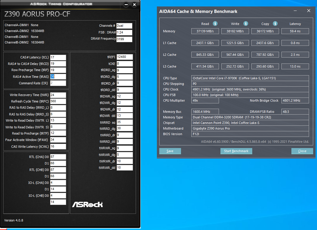 Добрый день! Мать Aorus z390 pro Память Samsung M378A2K43BB1-CRC - две штуки по 16гб. Почему то низкие показатели на бечмарках Вторичные тайминги на авто DRAM v 1.35 CPU VCCIO 1.25 CPU SAV 1.35