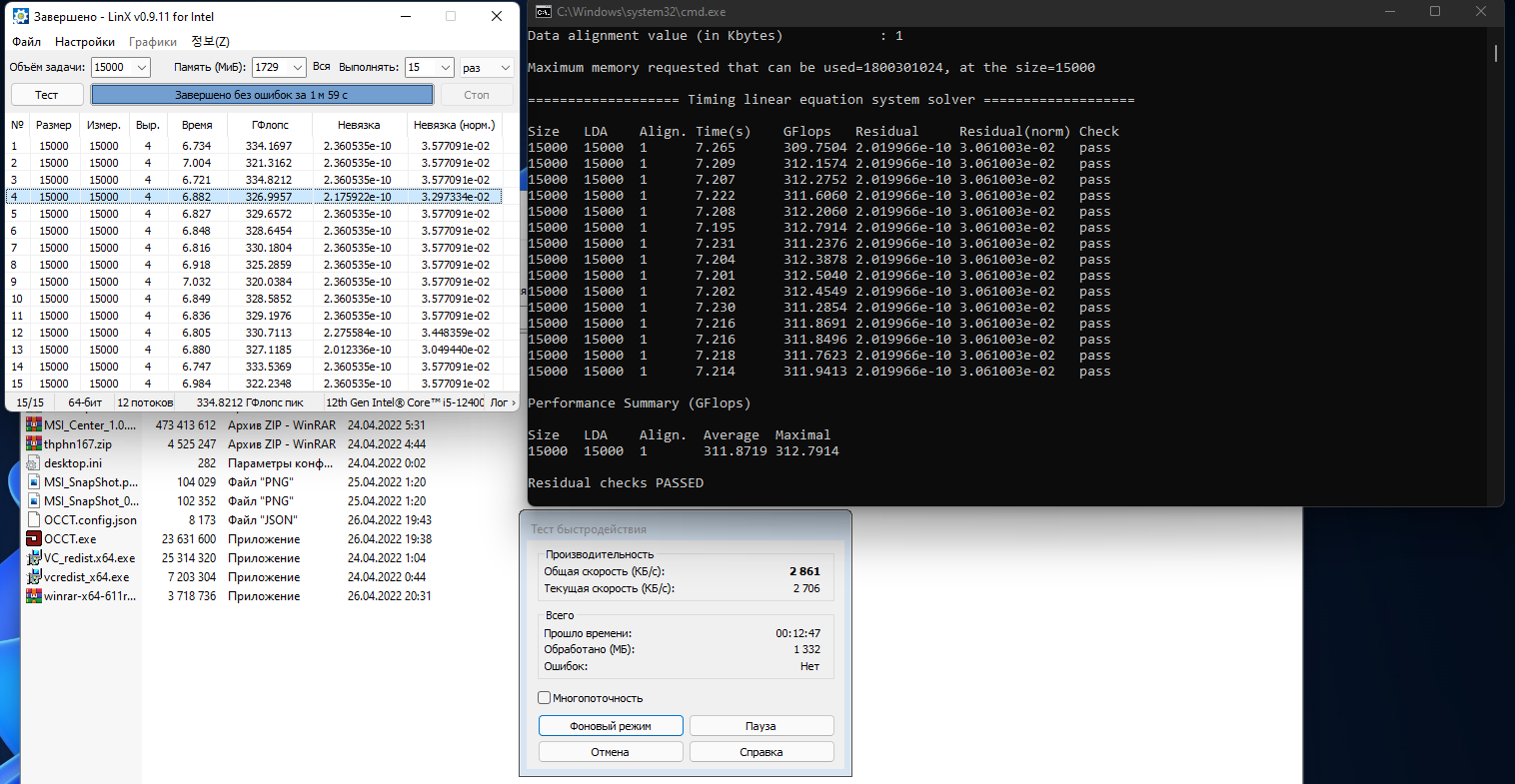 процессор в стоке, зафиксирован на 4гц, напряжение в авто. Что могу сказать, если и использовать LinX, то только через bat файл, чтобы не было рандомных невязок! Архив с батником от уважаемого angr. Воткнул в 1 поток бенчмарк winrar, запустил linx, сразу посыпались невязки. Собственно на скриншоте всё наглядно видно - 15к/15 прогонов. Linx 3 рандомные невязки, через батник всё идеально ровно. Это подтверждает зависимость линкса от фоновых процессов.