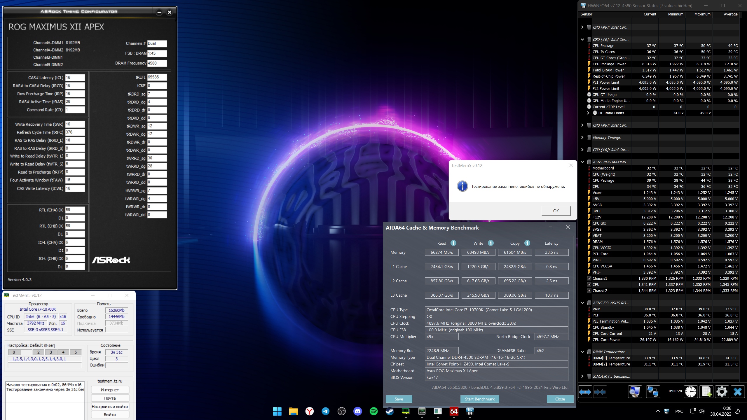 А нечётные первички как-то могут влиять на стабильность? Было настроено гир1 4000 мгц 15-15-15-32 с ужатыми по таблице вторичками и третичками. Все тесты стабильно проходились без ошибок: tm5 extreme и universal-2, karhu часа 4, единственное prime95 blend часа через 2 вылетал в синьку. Пару раз вылетала coh2 и bf5, но очень редко и не придал этому значения, а тут решил поиграть в God of war и начались постоянные вылеты(память на воде, максимум 33-35 градусов), перенастроил 4000мгц с 16ми первичками и вылеты прекратились. Сейчас сделал 3866 14-14-14-32. Tm5 extreme/universal-2, karhu - всё так же стабильно и игра не вылетает: