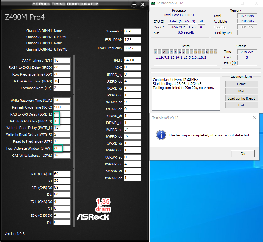 Когда перешел на 3333, некий "bandwith" (хз, что это такое), переменился с "0-1-2-2" на "0-0-0-0". При DRAM=1,4 универсальный конфиг ТМ5 показывал ошибку. Перешел на 1,37 - ошибок нет.