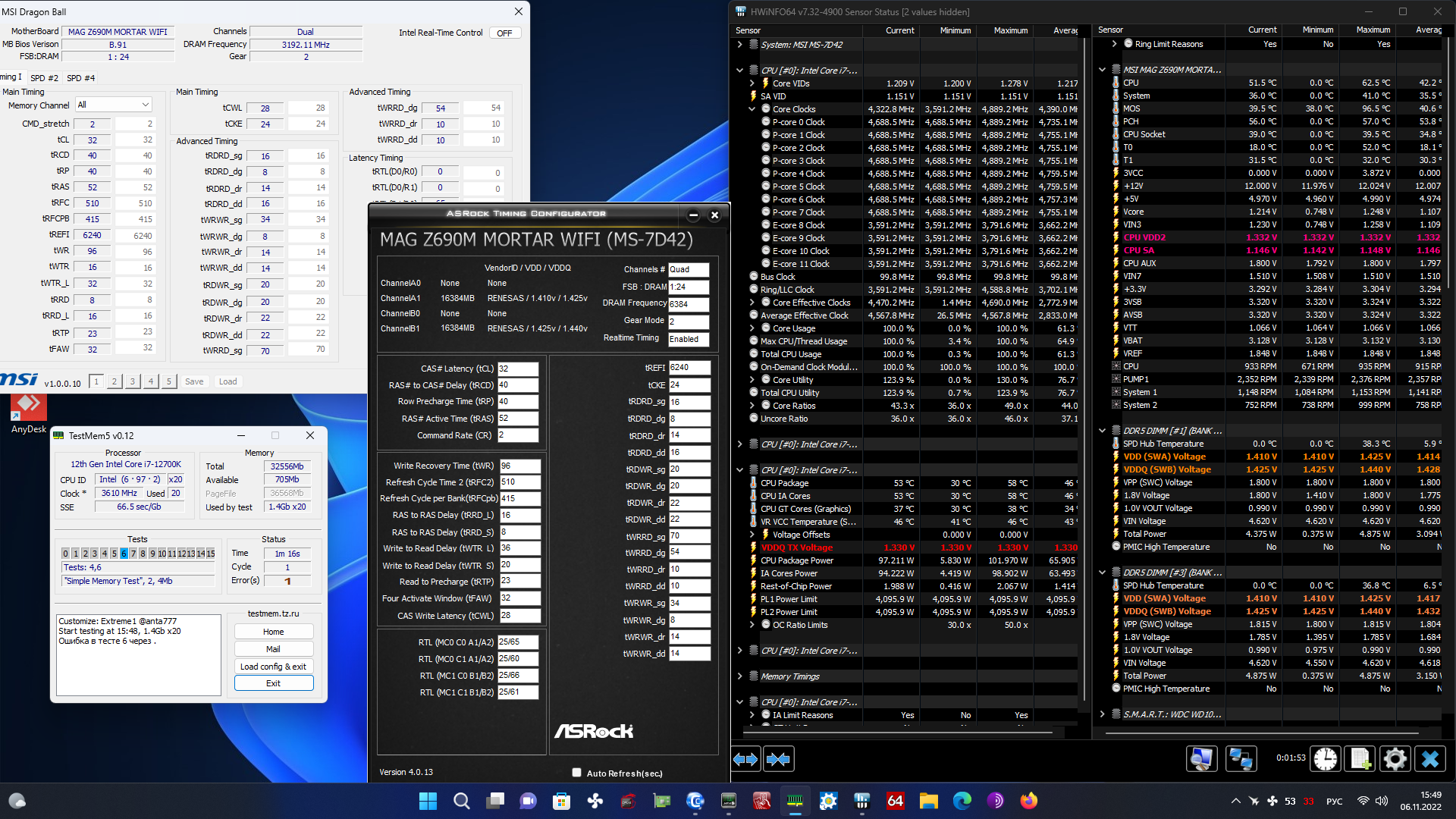 такс, начнем тогда с поиска SA нормального. ставь пока на память 1.435(максимум без анлока) VDD2 1.35 = VDDQ TX, а SA начни с 0.95 и тестировать тестмемом на продолжительность теста (например на 0.95 через 5 секунд ошибки, а на 1в через 2 минуты) и повышать SA в винде через MSI Dragon Power и найти значение на котором больше всего идет тестмем. Как найдешь - будем остальное ковырять.