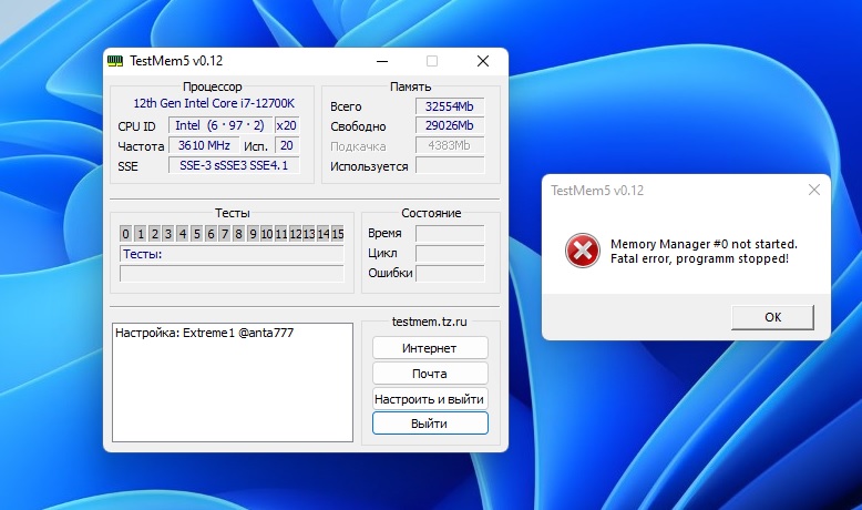 Подскажите, в процессе отладки TestMem5 перестал запускаться с другими пресетами. Пробовал перераспаковывать - без результата. Есть мысли, как лечить, это может непосредственно с памятью быть связано? Еще такой вопрос, может ошибку во время теста вызвать запуск параллельных программ или при правильной настройке ошибок не может быть в принципе?