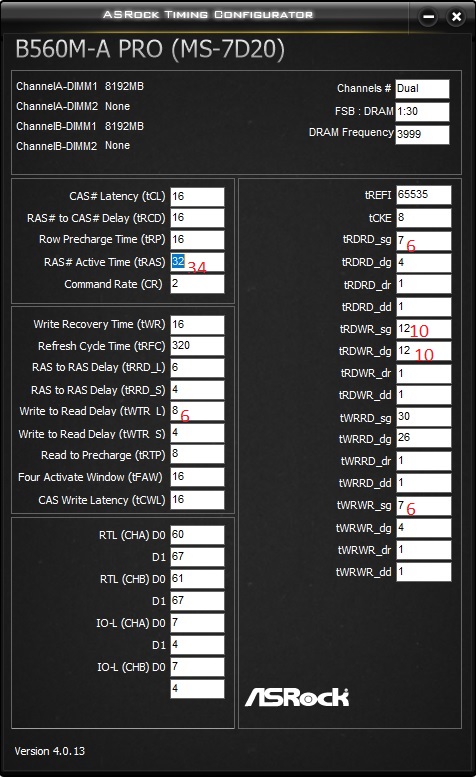 tRASmin=tCL+tRCD+2 WTRS/L устанавливаются в биосе через WRRDdg/sg согласно формуле: WRRD_sg=6+CWL+WTR_L WRRD_dg=6+CWL+WTR_S WR - через WRPRE (для матплат ASUS): WRPRE=4+CWL+WR RTP - через RDPRE (для матплат ASUS) RDPRE=RTP