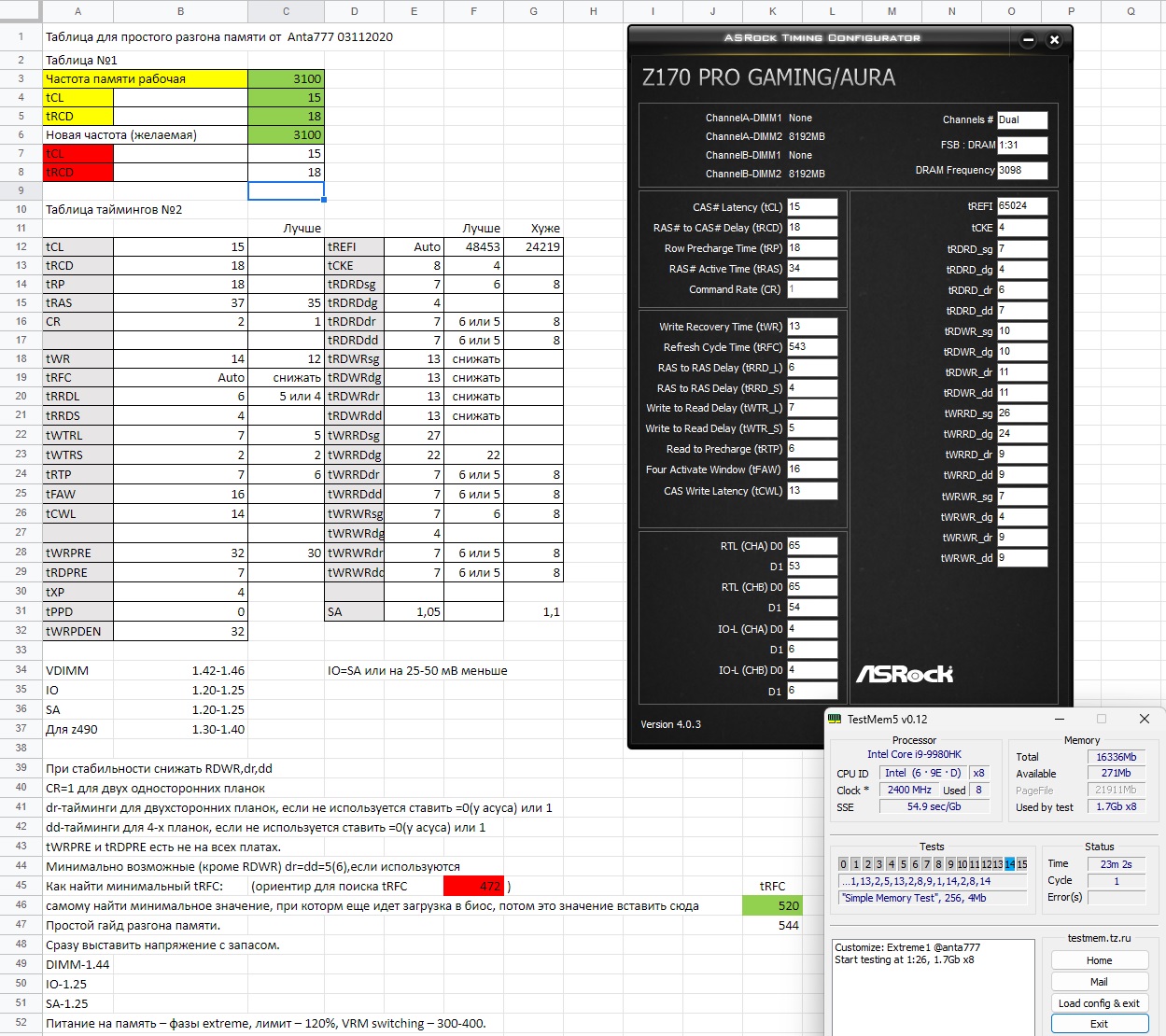 Универсальный гайд. 0. Устраните любые потенциальные проблемы с другим железом. Снимите разгон с видеокарты, снизьте частоту цп на 300 с сохранением напряжения. Не забудьте вернуть RTL в авто если сейчас не авто. 1. Крутим очень короткий мемтест, то есть если минуту живёт сразу снижать тайминг дальше. Ищите не стабильность, а явно сбойное значение тайминга, запишите его - пригодится. Гораздо проще найти явно нерабочее значение и от него плясать чем пытаться ловить нестабильность часами. Это также помогает диагностировать сбойные тайминги на ранее "стабильной памяти". Не пытайтесь найти предельные значение сразу. Сначала скрутите до +2 от минимально стабильного. Многие тайминги идут параллельно поэтому бессмысленно пытаться скрутить до упора с первого прохода. CR выставить на 2 если стоит 1. В самом конце можно попробовать скинуть до 1. 3 Ставить только на очень большую частоту или если по другому ну совсем никак.