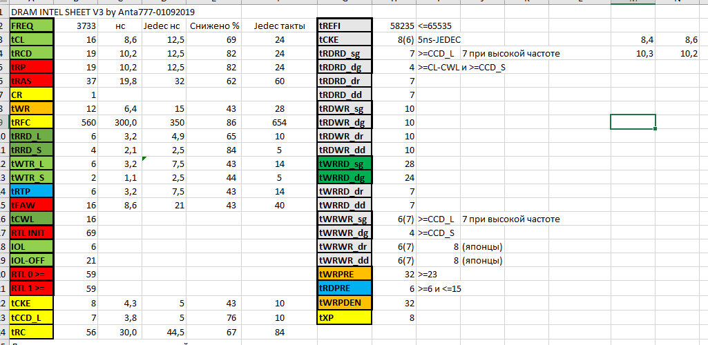 Начните с RCD, CL. Не обязательно должны быть одинаковыми, обычно CL идёт меньше чем RCD. RAS сразу пробуйте как RCD+CL+4, до этого значения от него существенная разница, дальше меньше. CWL<=CL. Допустимые значения 9,10,11,12,14,16,18,20. RP можете выставить по RCD, если пойдёт меньше - тоже неплохо, не уверен правда насчёт смысла. RTP без формул. Если не идёт вниз можно попробовать поднять чуть чуть RP. В DDR4 явно связан с WR соотношением 2 к 1 (например WR20\RTP10), физически хранится одно значения и в зависимости от операции интерпретируется. Скрутите FAW до 16(так и оставьте если работает). С таким FAW скручивайте RRD(оба, L обычно больше чем S), возможно поедут на 4 оба. Если до 4 не удалось спустить поднимите FAW до уровня RRDL*4 и попробуйте ещё, хотя это скорее всего уже почти предел. Обычно L>=S. L - SG(Same Group). S - DG(Different Group) Напр. RRD_L>=RRD_S. CKE=5 СCDL>=4 RDRD_DD и прочие подобные можно проигнорировать если у вас нет двух планок на один канал (4 планки). DD-Different Dimm. Тоже самое с DR-Different Rank если у вас одноранговая память. RDWR_SG(DG) и подобные сочетания скручивайте до минимальных рабочих, потом накиньте сверху +2. Как уже отметил обычно SG>=DG. WTR не трогайте он сам спустится когда будете скидывать WRRD_SG(DG) и прочие подобные. Если сам меньше не стал тогда руками скидывать. WR снижать через WRPRE если есть. Если нет или не снижает WR, То скрутите его скажем до 12 или +4 от рабочего, потом дожмёте если не лень будет. RFC явных формул нет, крутить после всего списка сверху. Не пытайтесь найти его минимальное значение если не хотите чтобы память начинала сыпать ошибками от любого чиха. найдите пограничное со стабильностью значение и накиньте сверху 20 или сразу 40. Может реагировать на RAS+RP, RRD, FAW, причём в обе стороны (то есть может "сломаться" если задрать названные), а может и не реагировать... REFi больше лучше. Связан с RFC. REFI сколько память "работает" - RFC сколько "отдыхает". Оба тайминга лучше не пытаться найти предельное значение.Заметно реагируют на температуру. Многие тайминги отзываются и на температуру и на напряжение. Поскольку напряжение может как позволить снизить тайминг, так и увеличить температуру, то середину можно искать очень долго, поэтому лучше бы вовремя остановится. Тестируйте тщательно с перезагрузками, сном, холодным стартом. RTL и IOL вам кто-то другой пусть советует как настраивать, от них у меня голова болеть начинает...