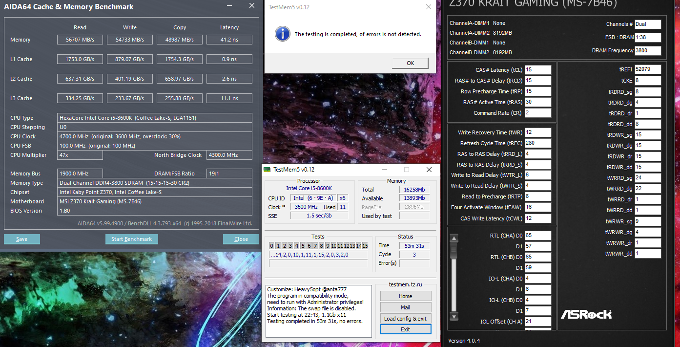 - Менял sa/io 1.1-1.25, все одно и то же, если неудачно натренировалось - серит ошибками сразу. На скришоте 1.15(sa 1.168, io 1.160); - Делал заниженные sa/io, тренировал, выключал тренировку и повышал sa/io - безрезультатно. Наоборот тоже делал; - Переставлял плашки в другие слоты, выяснил что 4 слот багнутый и на нем не работает например 3600cl14(вообще не запускается), и другие некоторые частоты. На скриншоте используется четвертый слот; - Естественно проходился по гайдам разгона ддр4, да я там видел tccl поставить на 8 - нет; - Понижал разгон процессора, убирал разгон процессора, выключал энергосберегайки и все такое;