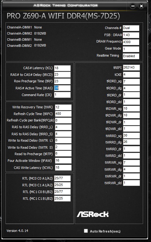 Сейчас пока выставил 19-19-19-39 штатно на 4320 (проц разогнан по шине, поэтому такие странные значения), все остальное в авто.