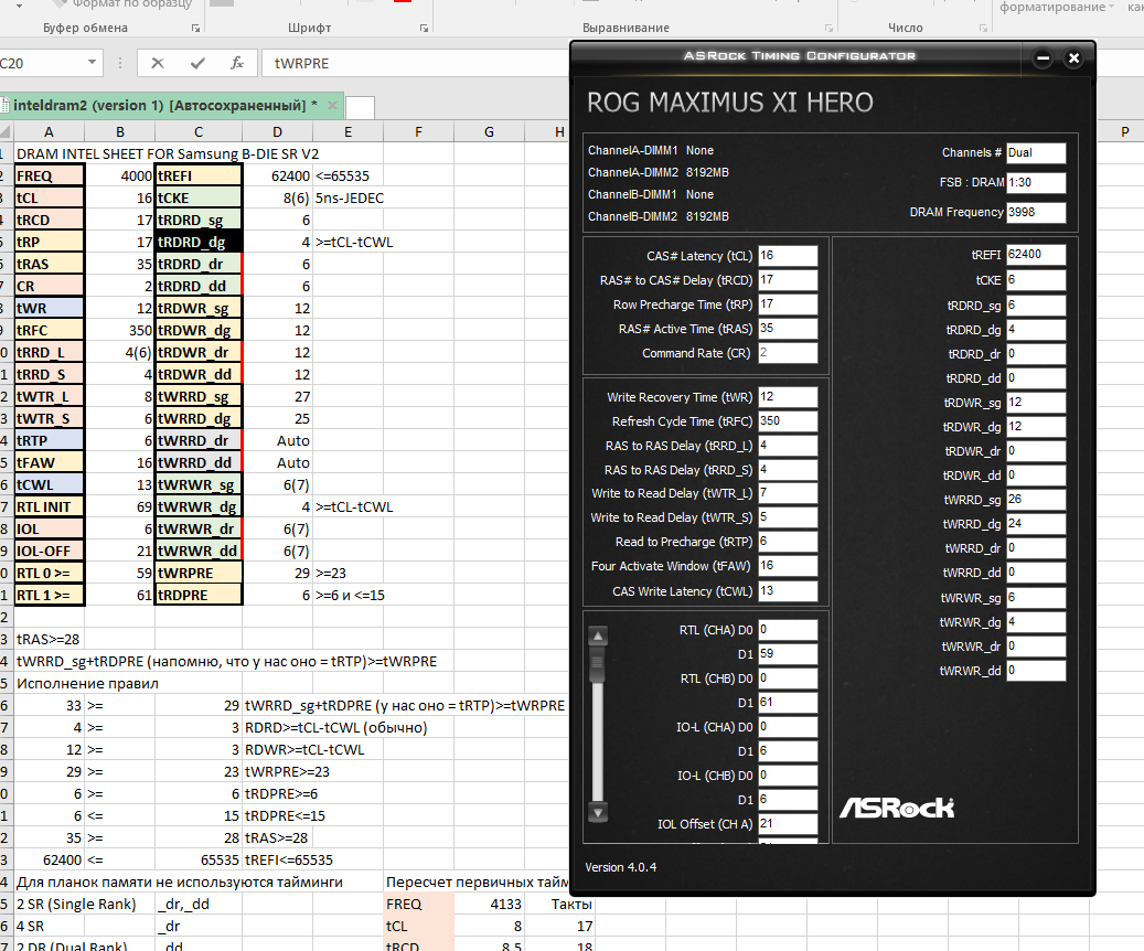 binarycraft Делаем: tWTR_L и tWTR_S оставляем в авто, т.к. они зависят от tWRRD_sg и tWRRD_dg Ставим как по кальке. tRAS по кальке будет другой, наверное tCWL после этих действий проверяем как по кальке, может и заработает, но у вас 4 планки памяти, может в этом дело... Ну и tRDWR_sg, tRDWR_dg, tRDWR_dr, tRDWR_dg скорее всего 11 уже не будут работать Попробуйте сначала исправить в кальке в ячейке B16=B3-3 И выставьте что получится в биосе