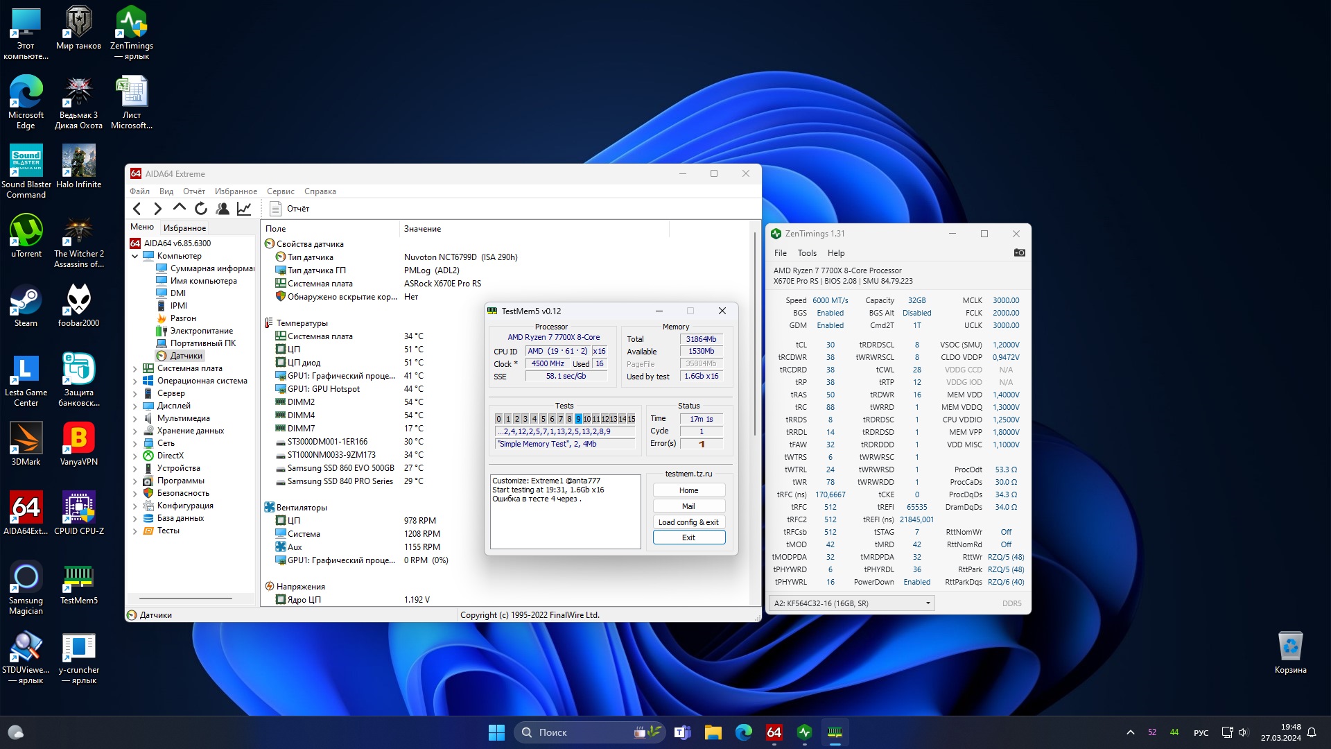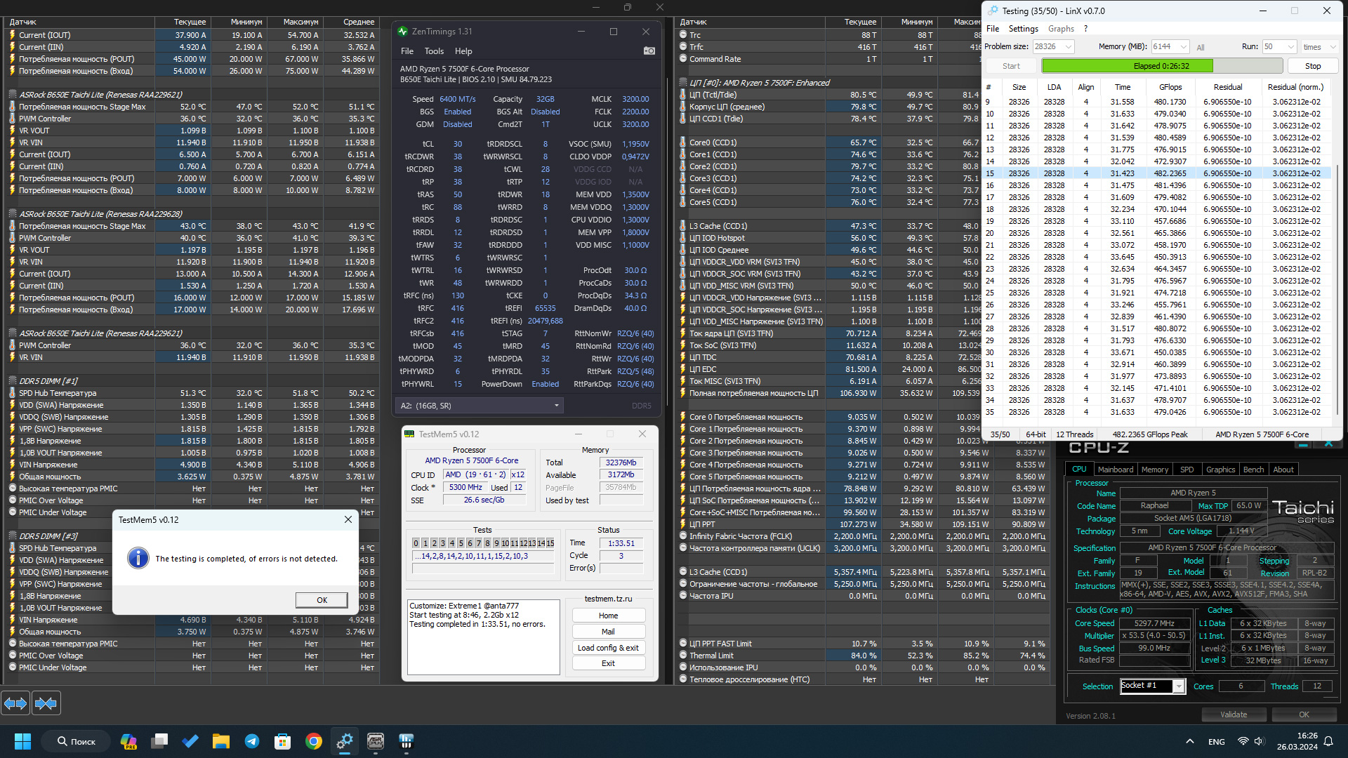Тест до сих пор идёт, уже 24 минуты, новых ошибок пока нет. Пробовал ставить другое напряжение - VDD 1,3500, результат такой же был. Я так понимаю, надо повысить tRFC, наверное (ошибка 4 на это указывает, вроде как). Вообще, я правильно всё выставил, не напортачил чего? И что ещё посоветуете попробовать? В прошлый раз не написал - память Kingston Fury KF564C32-16 (6400), m-die.