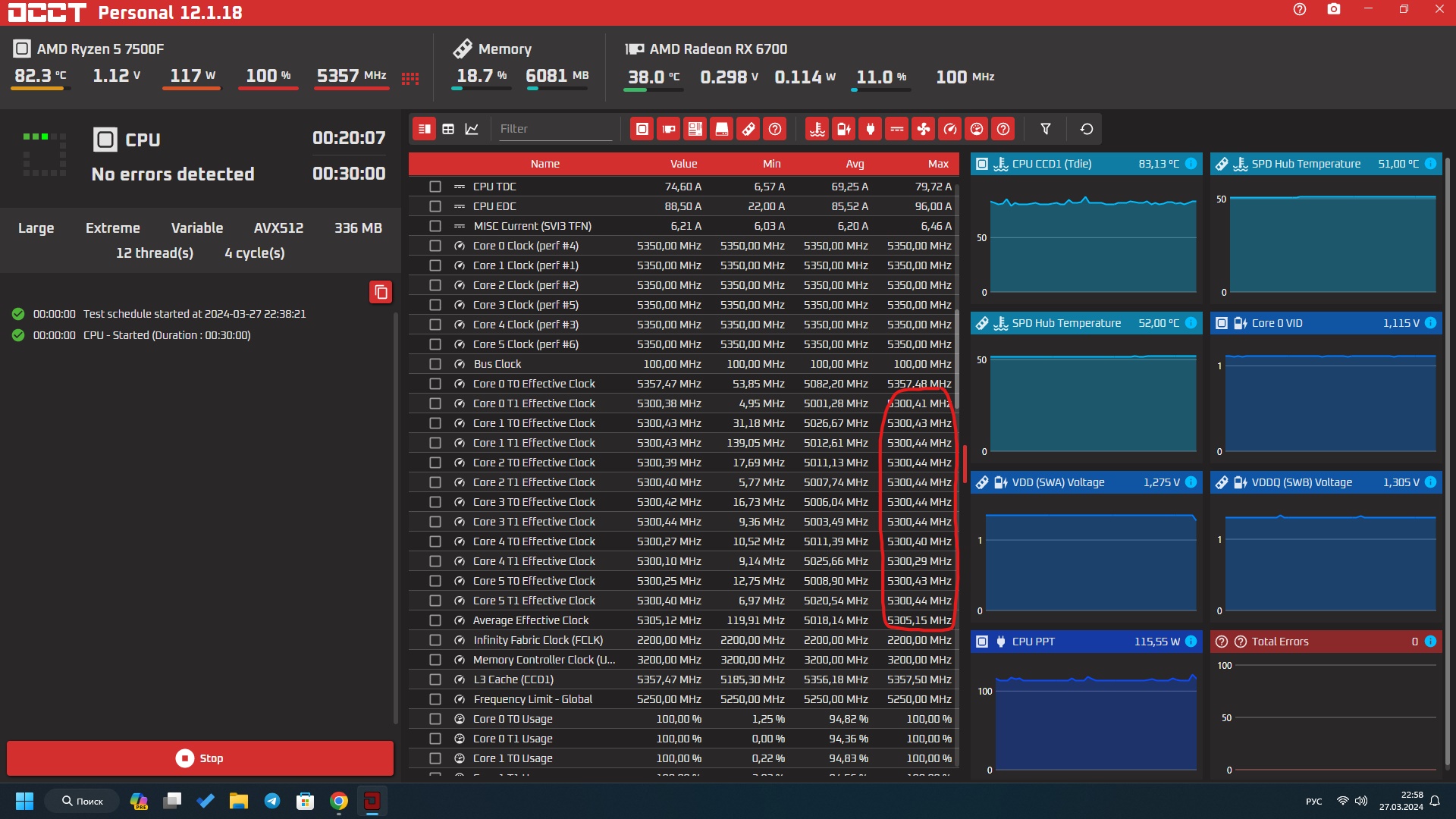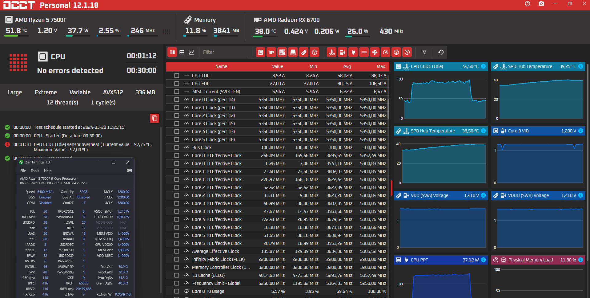 Не заметил сразу ваше сообщение. На самом деле я только 3 месяца сижу на новой платформе, потому подбор верных настроек у меня постоянный как и тестирование, то есть постепенно двигаюсь к более зажатым таймингам и высокой частоте процессора. Память вроде бы уже нашел, 1.5 часа прошла, синих экранов не ловил с момента как перешел на 2.10 биос и отжал 384 tRFC на 416. Отмечу, что для каждой платформы новая AGESA несет более стабильный разгон памяти, IF и процессора. 5350 на bios2.08 ехало стабильно 1.15v, на bios2.1 стабильно на 1.12v. Пока на 2 часа не ставил тесты, но 30 мин проходит без ошибок. Может я ошибаюсь конечно, но за пару лет тестирования у меня сложилась такая вот картина по тестам - если OCCT проходит 30 мин, с вероятностью 90% он пройдет 1, 2 часа.