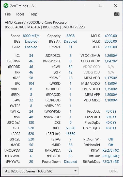 Пробуйте. Только первички cl30-38-38-50 и вторички свои оставляйте, и rdwr 16, остальное под копирку смело, должно работать. Если нет - поточнее скорректируем, но третички все вообще хлам у вас. Напруги vsoc vddp с просадкой зен рисует если что. По факту vsoc 1.150 vddp 1v (его можно в авто оставлять если не завышает так что начинает догонять vsoc более чем на -0.150v)