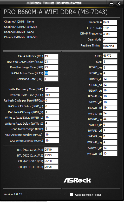 Конфиг! CPU Name: Intel® Core™ i5-12400F Motherboard Model: MSI PRO B660M-A WIFI DDR4 (MS-7D43) Total Size: 16 GB Type: Dual Channel DDR4-4400 SDRAM (CL 19; tRCD 23; tRP 23; tRAS 44; tRC67 CR 1T) Slot #2Module: A-Data SK Hynix 8192 MB (DDR4-4133); Single Ranks, 16 bank; Voltage 1.4; Hynix D-Die; Slot #4Module: A-Data SK Hynix 8192 MB (DDR4-4133); Single Ranks, 16 bank; Voltage 1.4; Hynix D-Die.