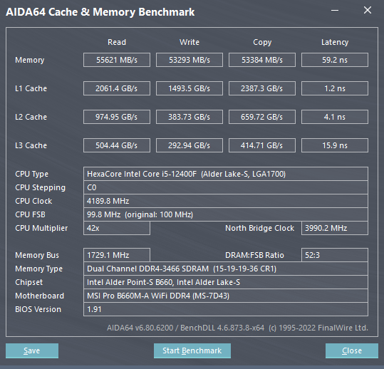 Подскажите пожалуйста, на alder lake а именно процессоре 12400f может быть латентность в районе 55-60 это норма? Контроллер памяти в моем случае частоты выше 3433mhz не держит. В TM5 extreme не ошибки, а глухое зависание. На частоте 3433Mhz с таймингами cl15-18-18-32-CR1, напряжение 1,4, соответственно gear 1, латентность держится в районе 58-60. На частоте 4533Mhz с таймингами cl19-23-23-45-CR1, напряжение 1,47, соответственно gear 2, латентность держится в районе 68-69. Стабильно работают обе вариации.