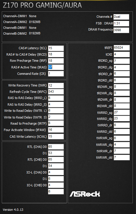 tRASmin=tCL+tRCD+2 WTRS/L устанавливаются в биосе через WRRDdg/sg согласно формуле: WRRD_sg=6+CWL+WTR_L WRRD_dg=6+CWL+WTR_S WR - через WRPRE (для матплат ASUS): WRPRE=4+CWL+WR RTP - через RDPRE (для матплат ASUS) RDPRE=RTP
