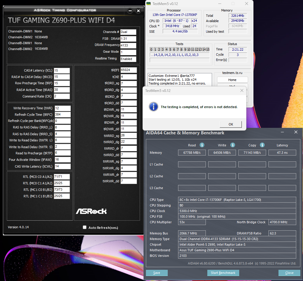 Здравствуйте, разгонял память, посмотрите можно ли что-то поправить, латентность была 59. Спасибо. ПРОБУЮ В ПЕРВЫЙ РАЗ. Заводилась она и на 4266 но латентность была 75. Все тесты проходит.