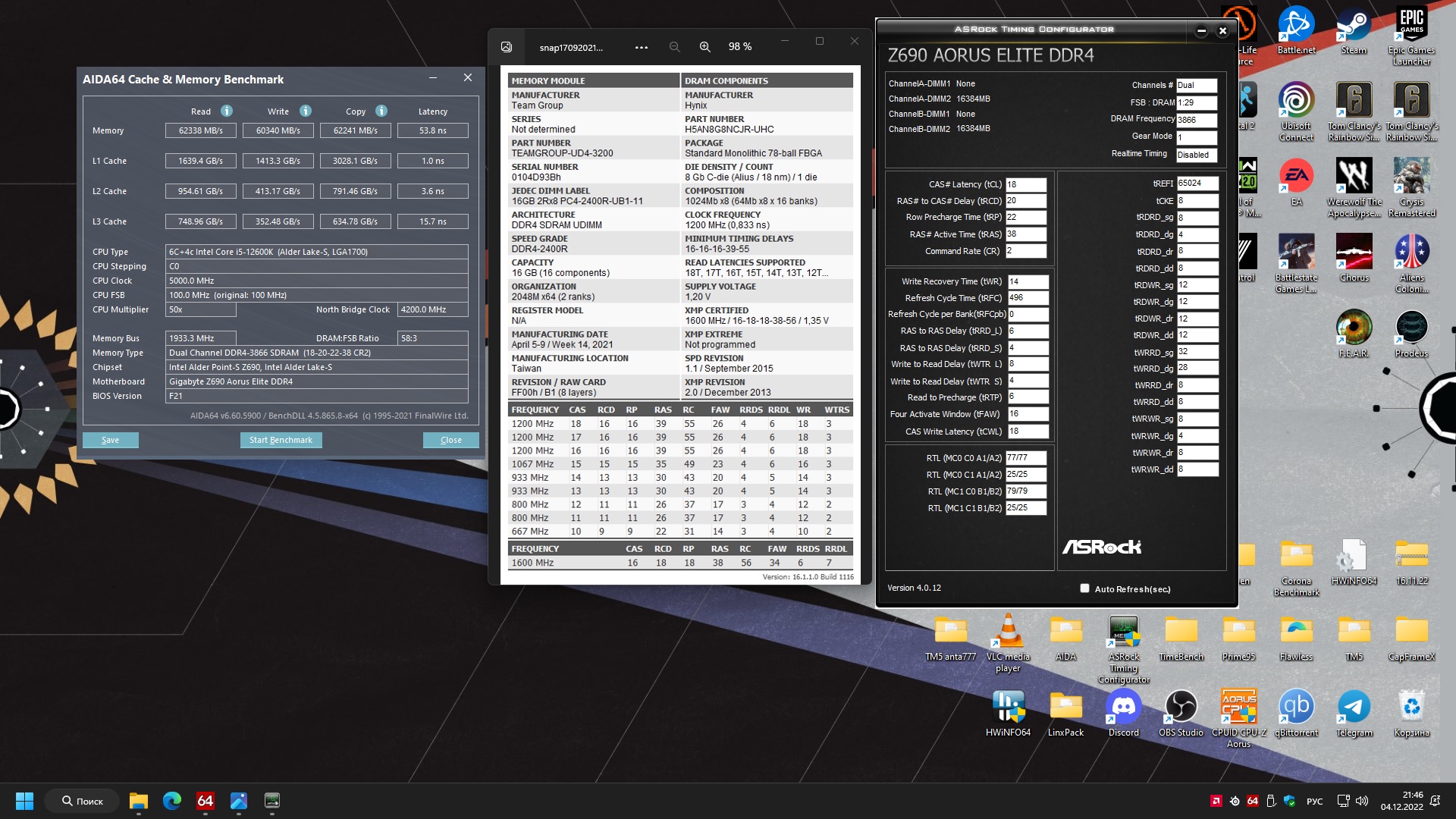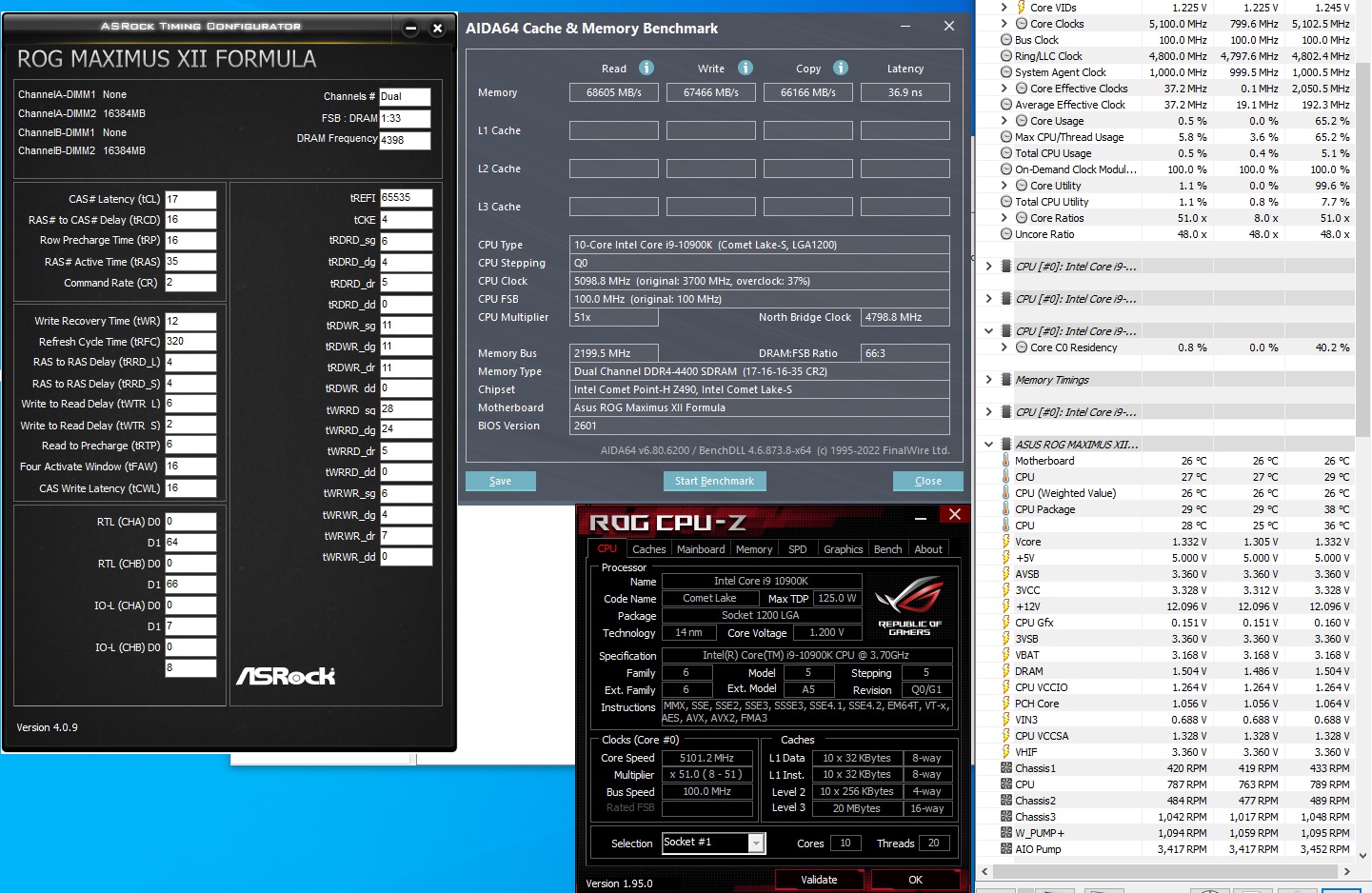 Я, кажется, всё. Переход с Z390 на Z490 прошел достаточно безбоблезненно. За исключением необходимости смены комплектов памяти с 4х8 на 2х16, поскольку daisy chain Asus Maximus XII Formula в случае с 4мя планками памяти отказывалась стабилизироваться выше 4000. Впрочем, 16-15-15-33 были вполне стабильны на планках B-Die от Patriot 4400 19-19-39. Нынешний кит под маркой HP модели V10 48U45AA#ABC имеет XMP 14-14-14-34@1/35v. Настройка заняла около недели, что я считаю совсем неплохо, вспоминая сколько месяцев в несколько подходов я бился с 4мя планками "Патриотов". Напряжения, к сожалению, не слишком радостные, но железо не планируется на долгие годы. В итоге: 4400 17-16-35-2Т@1.49v. VCCIO 1.30, VCCSA 1.32. LLC level 4, плата задирает напряжения IO/SA в нагрузке, что видно на скриншоте мониторинга hwinfo. Тестил нее предельно долго, поскольку уже и надоело, и система только под игры. VCCIO можно опустить до 1.26. Но вот SA/ VDIMM - никак. Как ни старался, но на 1.47 до психологической отметки в 1 час testmem5 anta777extreme не доходило. Возможно, для игрушек прокатит и пониже, это уже после сборки в контуре СЖО и настройки ЦП. Возможно, tRFC великоват, но слишком близко к значению на котором плата не проходит пост. И тренировка позорная, но с IOL 7 для канала B тоже не заводится. По RTT получились 80-40-40, но на величинах напряжений вообще никак не отобразилось. Спасибо всем причастным к оформлению шапки темы. Скрины