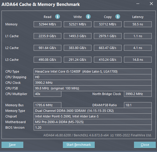 В итоге, на частоте 3600 MT/s, таймингами 19-20-20-40-1T (остальное в авто), Gear 1, Dram Ref Clock - 133, такой результат: