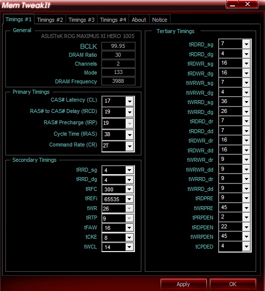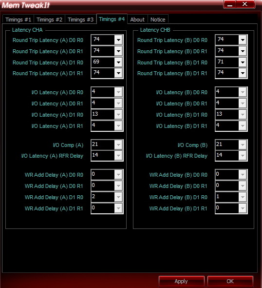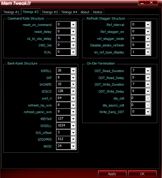 REFi больше лучше. Связан с RFC. REFI сколько память "работает" - RFC сколько "отдыхает". Оба тайминга лучше не пытаться найти предельное значение.Заметно реагируют на температуру. Многие тайминги отзываются и на температуру и на напряжение. Поскольку напряжение может как позволить снизить тайминг, так и увеличить температуру, то середину можно искать очень долго, поэтому лучше бы вовремя остановится.