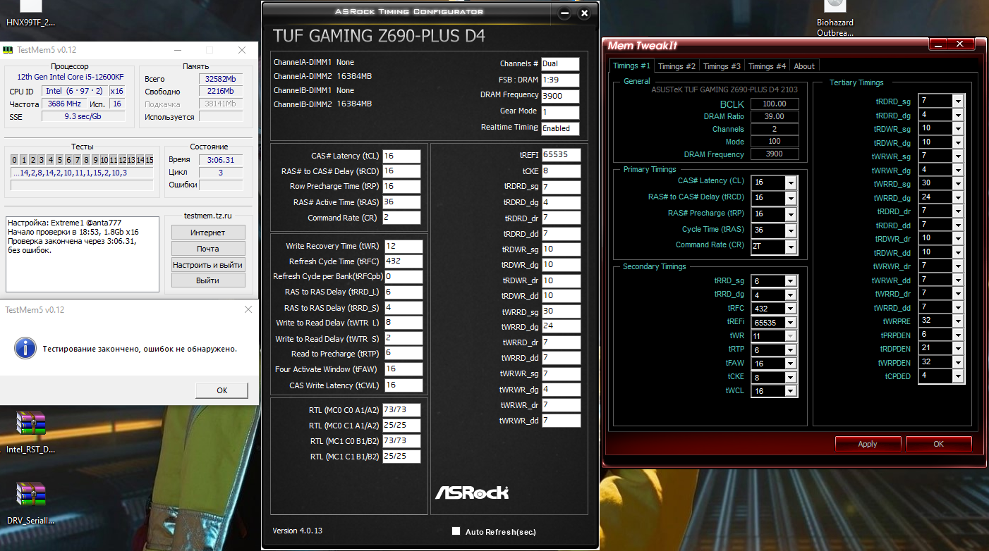 Пробовал снижать еще сильнее основные тайминги, оставляя прочие на тех же значениях с которыми все работало: tCL=16 — не грузится tRCD=tRP=21 — грузится, но в TM5 ошибки почти сразу tRCD=tRP=20 — не грузится